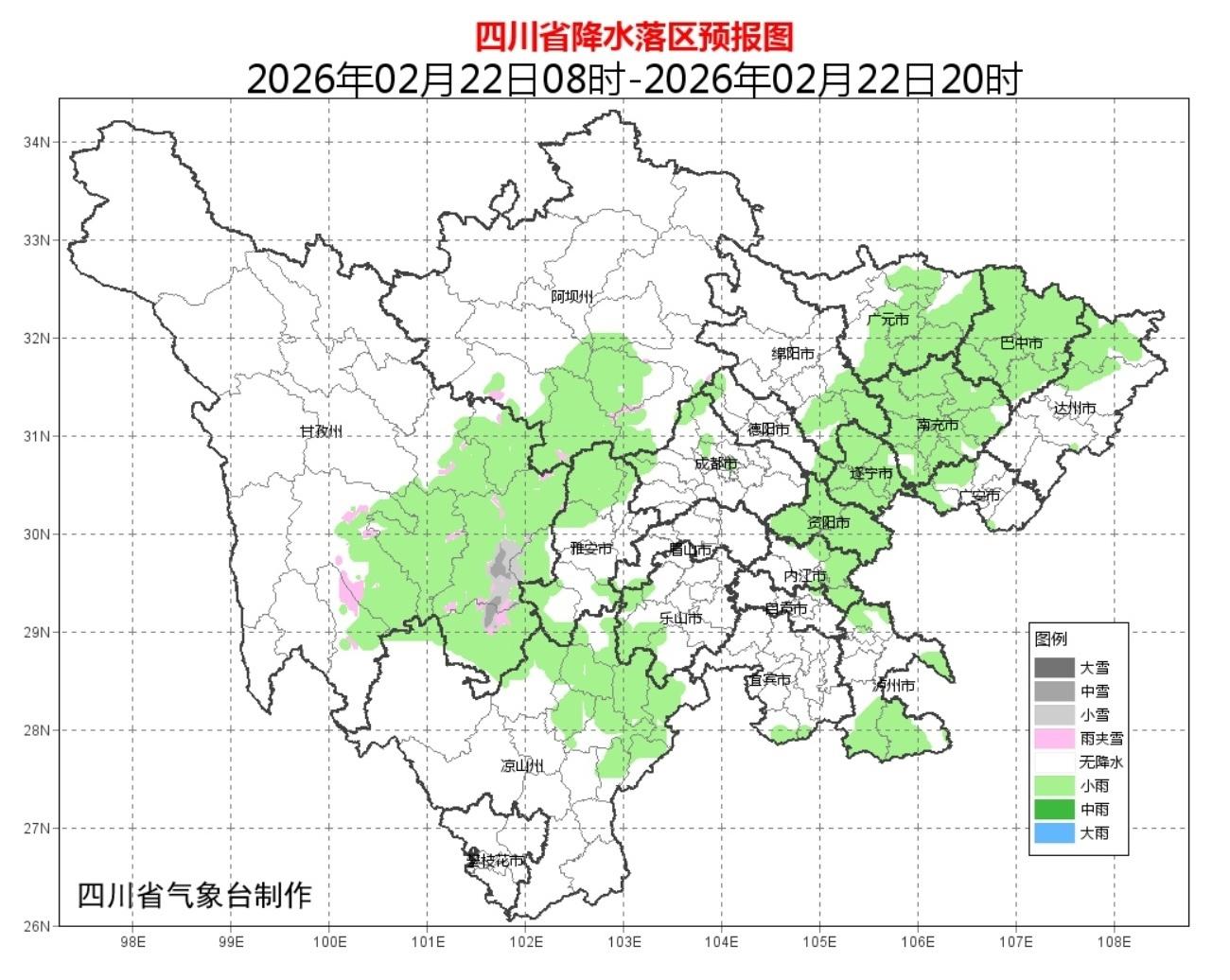 四川省气象台预计,22日晚上,盆地大部阴天有阵雨或雷雨,巴中、南充、广安3市及遂宁、资阳、泸州3市东部和达州西部有中雨,个别大雨;阿坝州南部、甘孜州北部东部和凉山州东北部阴天间多云有阵雪或阵雨,局地中雪,川西高原和攀西地区其余地方多云。