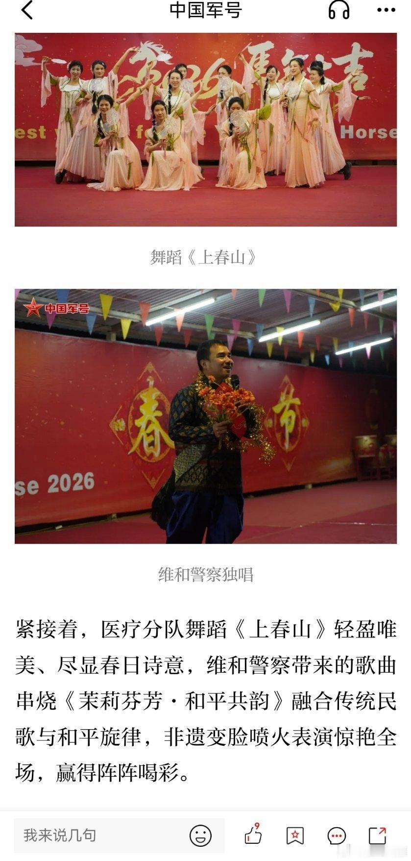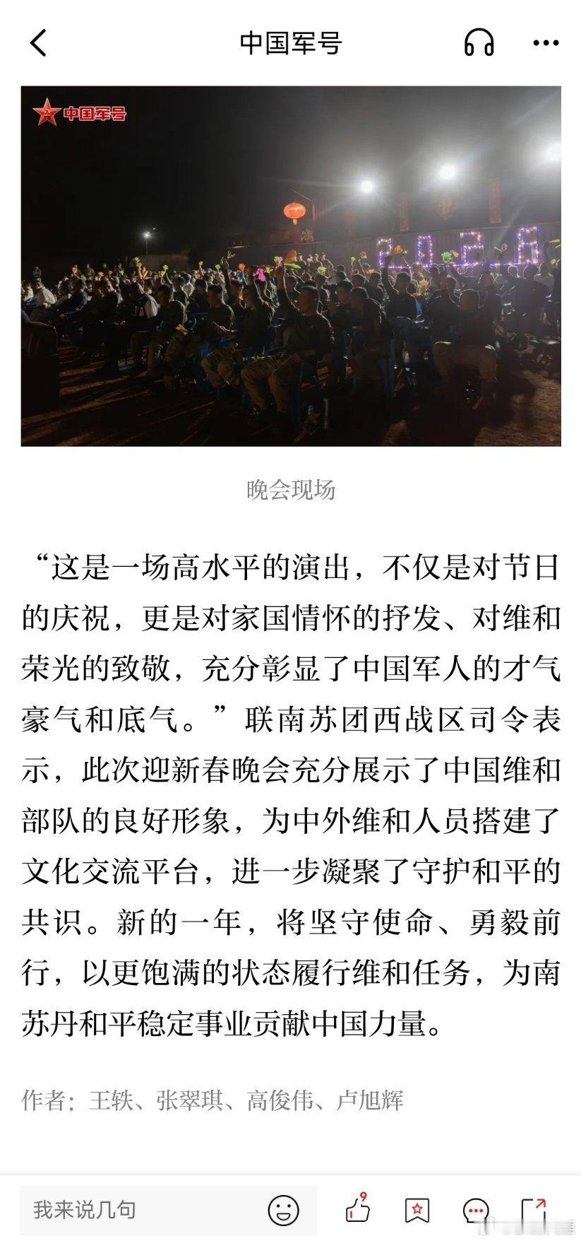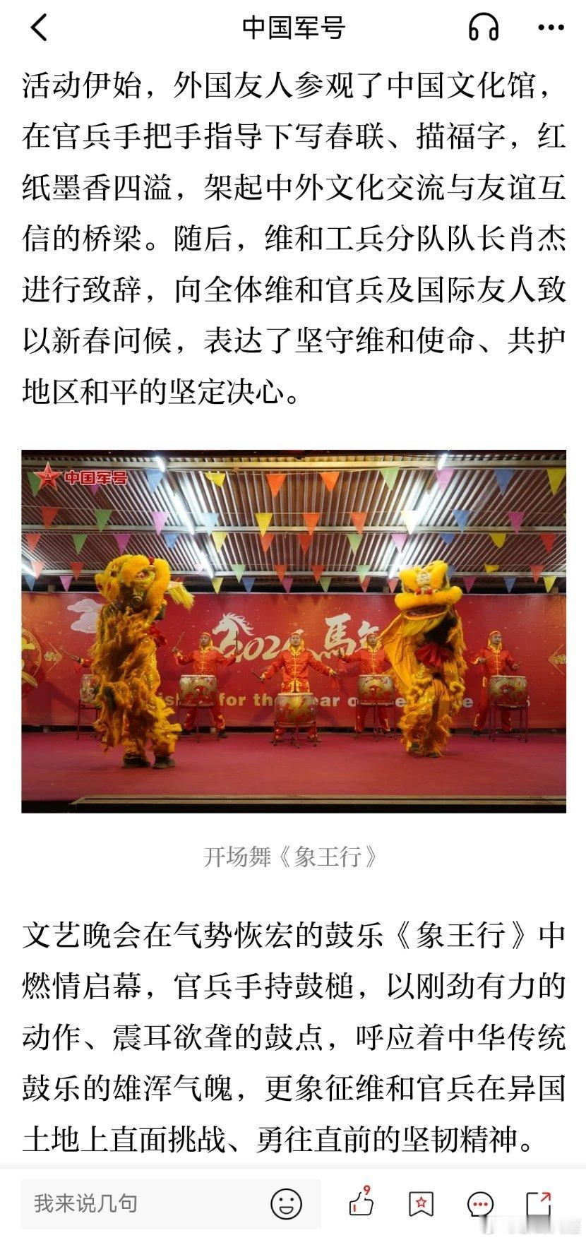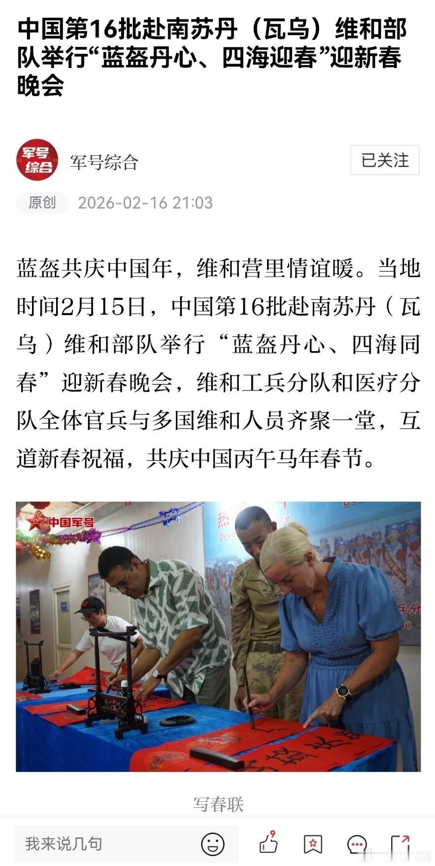蓝盔共庆中国年,维和营里情谊暖。当地时间2月15日,中国第16批赴南苏丹(瓦乌)维和部队举行"蓝盔丹心,四海同春"迎新春晚会,维和工兵分队和医疗分队全体官兵与多国维和人员齐聚一堂,互道新春祝福,共庆中国丙午马年春节。(中国军号)