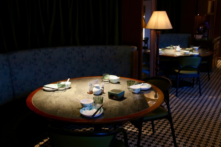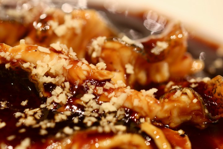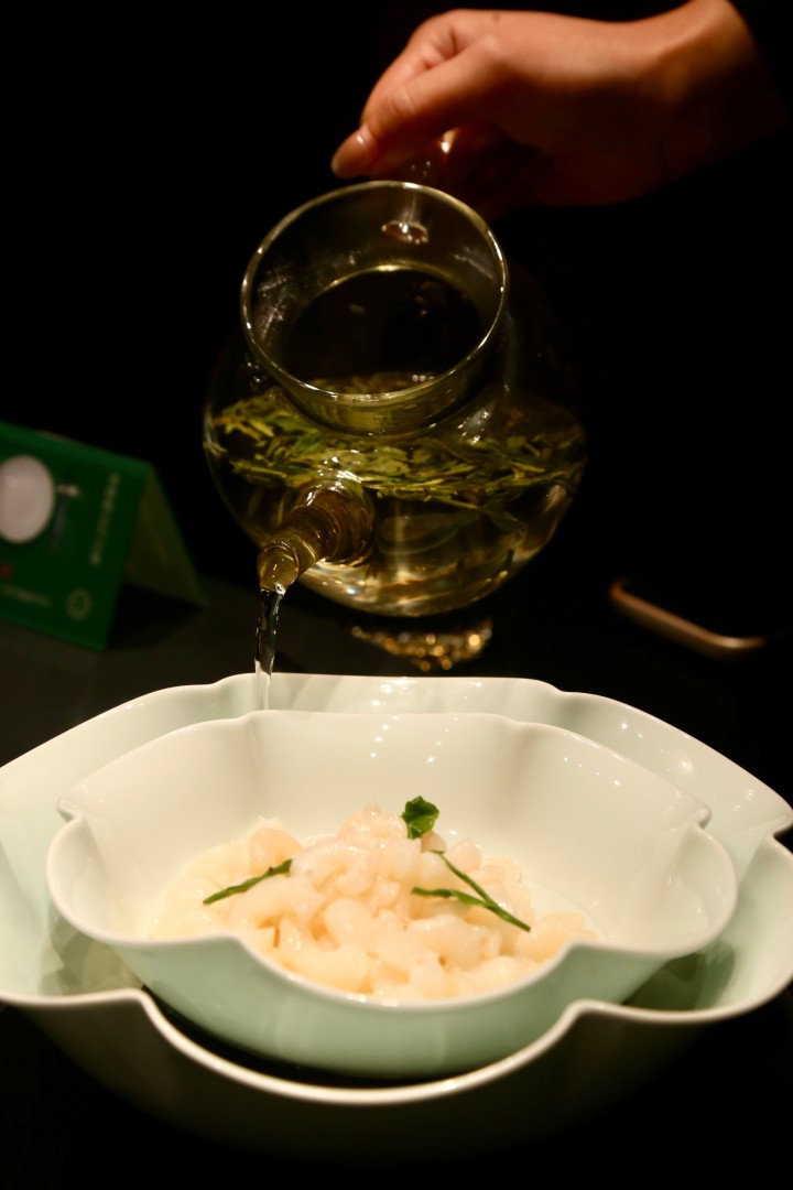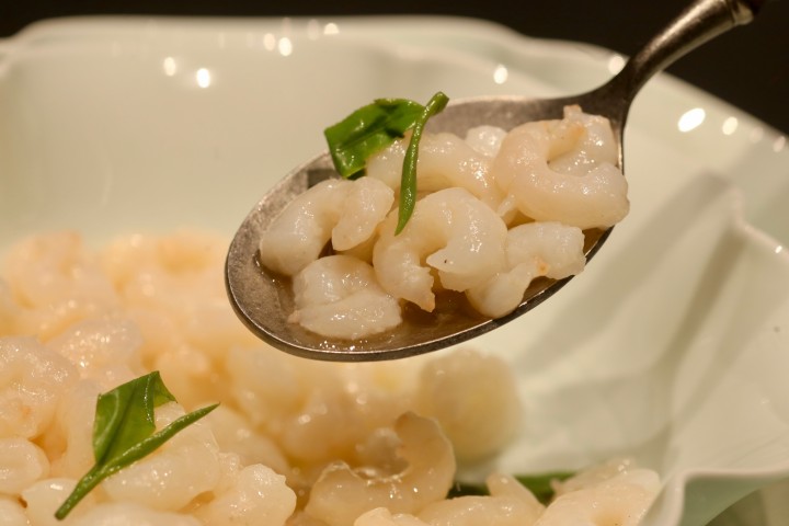 另一个需要服务员表演浇汁的,是龙井虾仁。宋大厨没有直接将龙井茶汤加在虾仁里,因为他认为茶汤的香气与高温爆炒并不兼容,茶香肯定闻不着了,所以在装虾仁的碗外面淋上茶汤,汤色清亮,龙井是龙井(香的),虾仁是虾仁(脆的)。