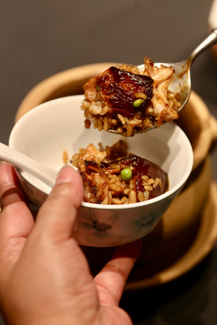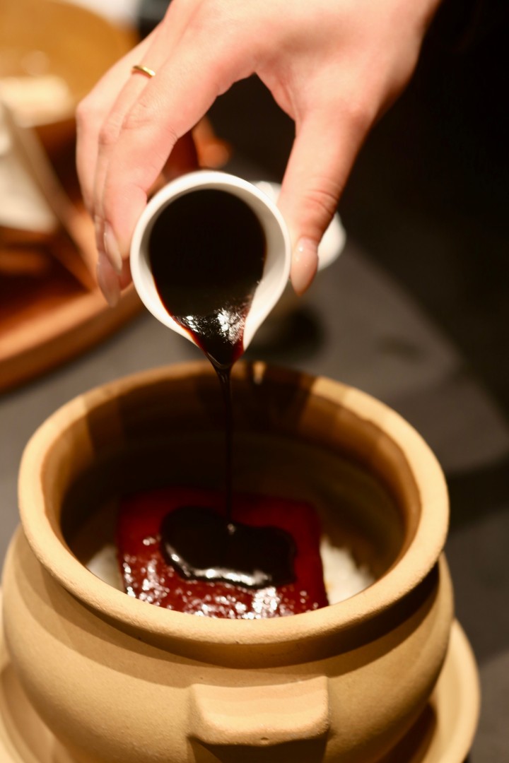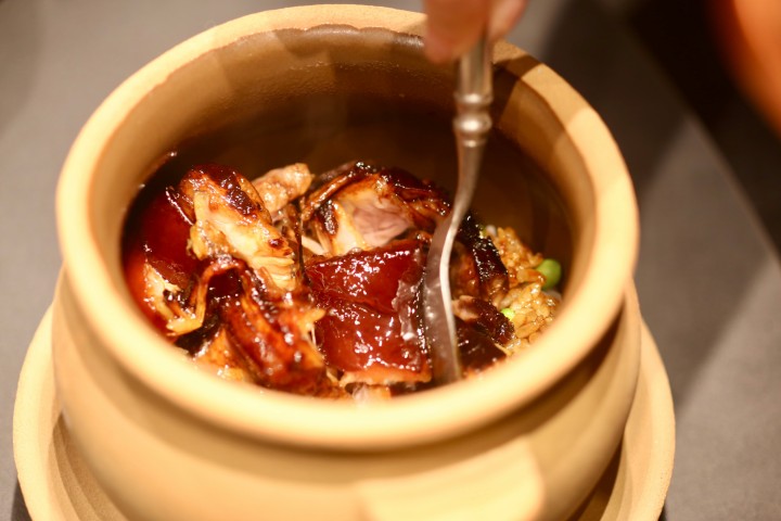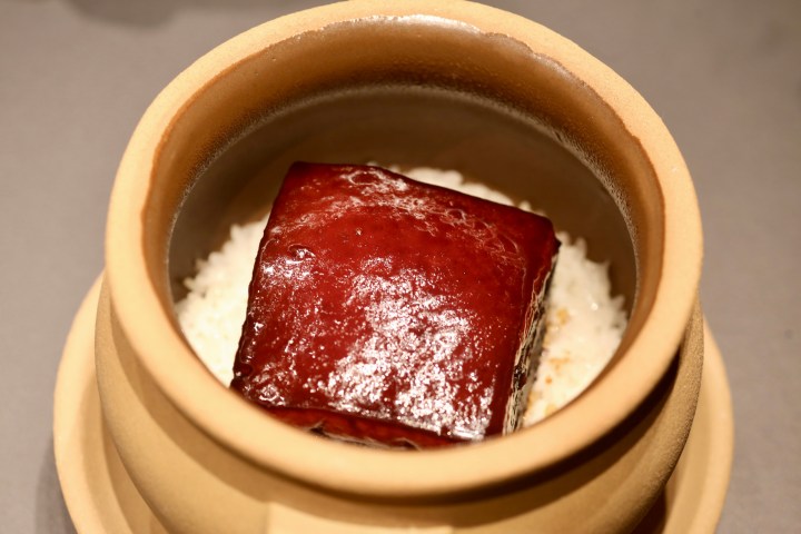 除了西湖醋鱼,还有一个著名的杭帮菜单品大受好评,那就是东坡肉。宋大厨给取了一个文雅的菜名“一方东坡”,选用的黑猪五花肉比普通的东坡肉要大一圈,不是放在小碗里,而是放在瓦罐里的米饭上,服务员现场浇上肉汁,再将东坡肉捣碎,瞬间肉香四溢,成就杭州人从小就爱吃的肉汤淘饭,有了米饭,才能达到真正的“肥而不腻”。