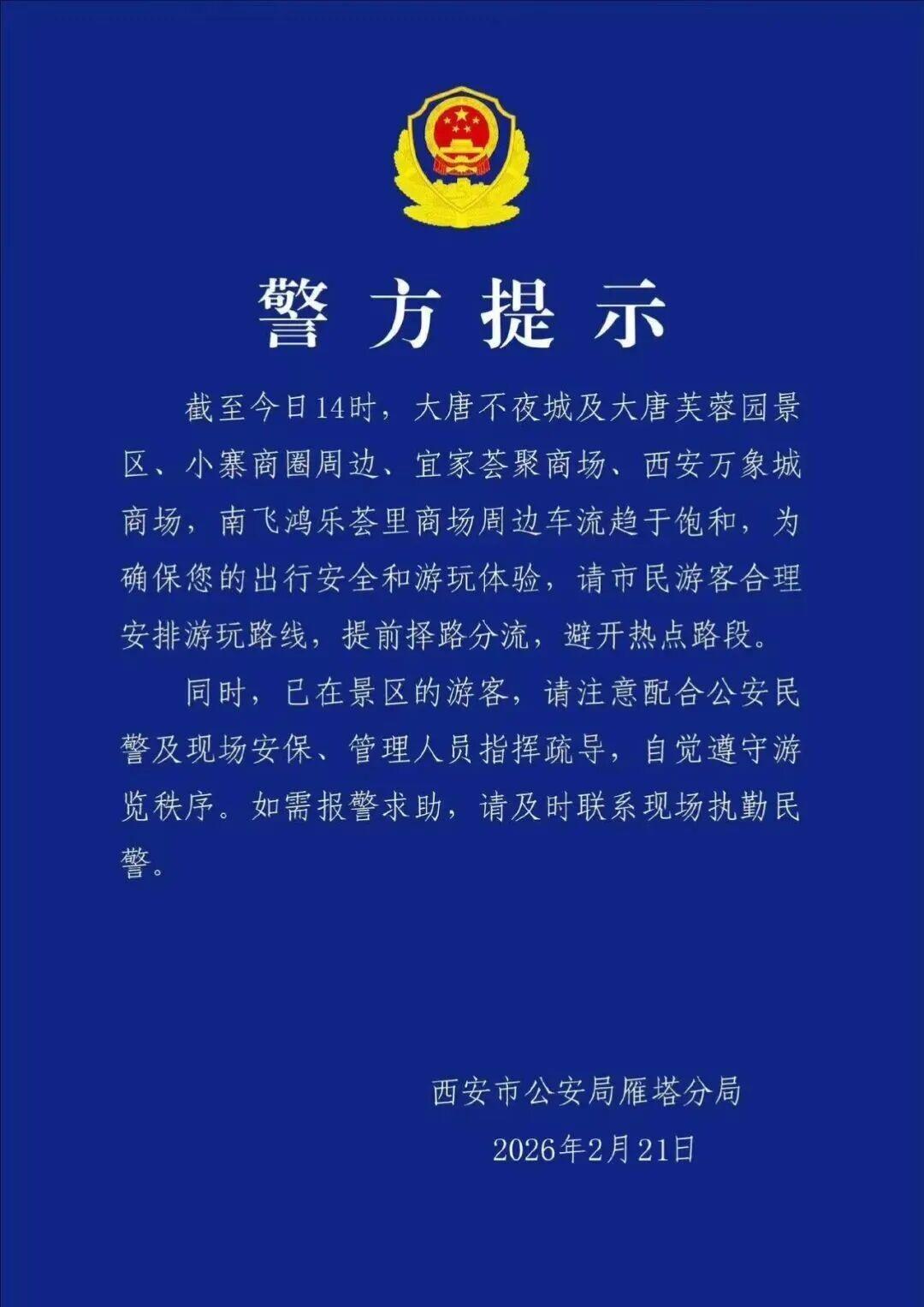 截至今日13时,钟楼、鼓楼、北院门文化风情街景区及周边区域,人流量、车流量较大,请合理安排行程、错时错峰出行。游览观光时,请积极配合公安民警和现场工作人员的指挥疏导,如需报警求助,可第一时间拨打110或就近联系执勤民警。
