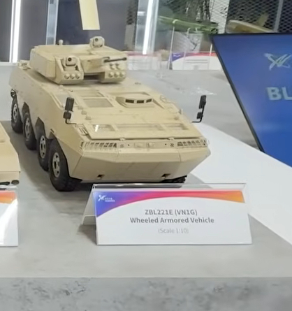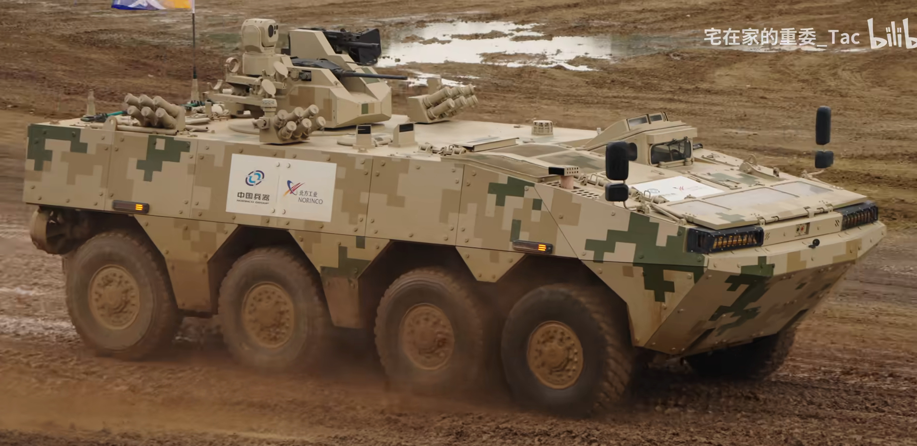 在今年沙特举行的WDS 2026世界防务展览会上,北方工业的展台上出现了基于新的VN1G 8x8底盘的轮式步兵战车,安装有UW5无人炮塔(图2)。VN1G也是一机集团继出口泰国的VN1C之后推出的新一代八轮产品,在前两届的珠海航展上首次亮相装输型(图3)及ST3A轮突型(图4)。