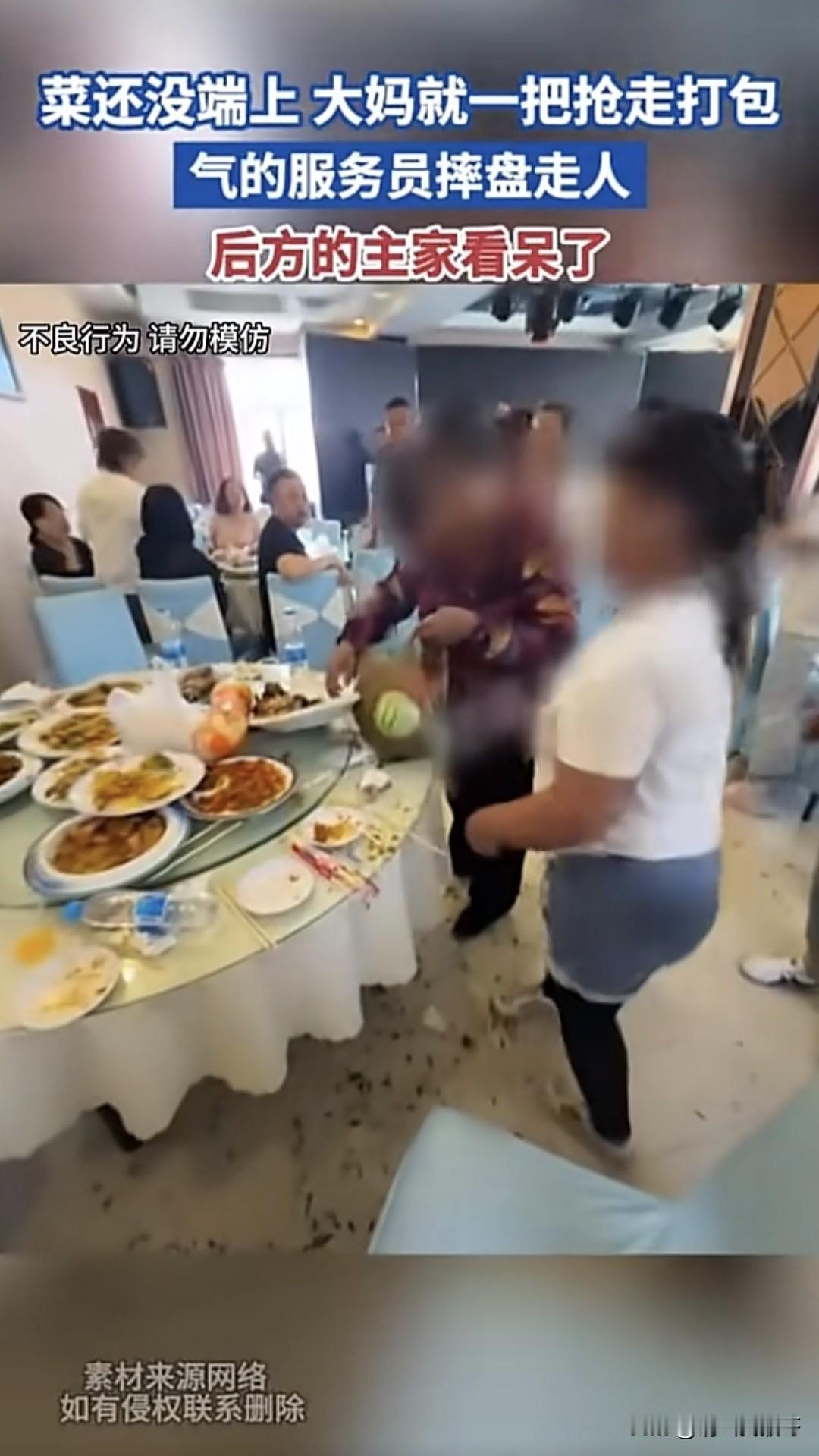 办酒席遇到这样的亲戚真丢人!近日一网友发视频称,家里因为喜事在酒店宴请亲朋好友,结果有个亲戚大妈在菜没上完的情况下,对着服务员手里的菜就下手准备打包,气的服务员直接把盘子扔桌子上了。饭后打包原本是一个提倡节约的好习惯,结果吃酒席的时候总有人“恶意打包”,有的菜客人都还没尝过,自己就想直接装袋子里打包带走,这种做法不仅自己丢人,还让请客的主人家脸上无光。你们生活中有遇到过这样的亲朋吗?