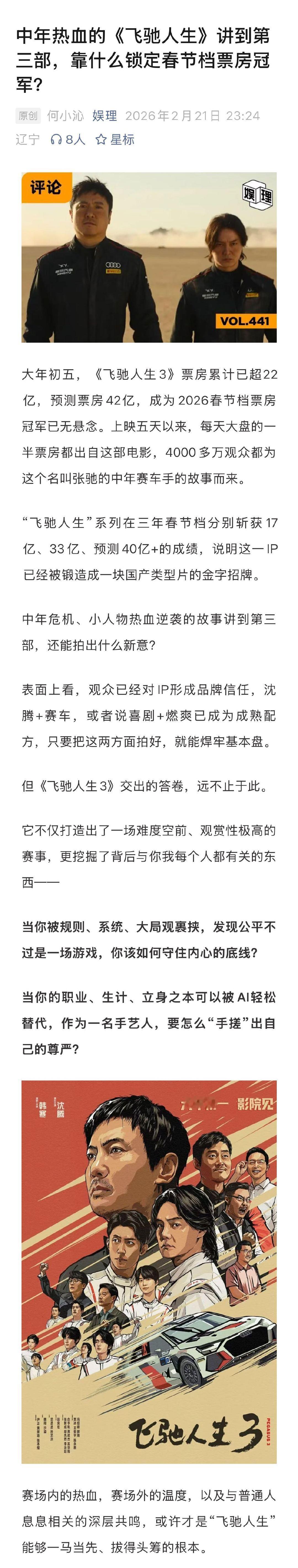 飞驰人生3手搓手艺人 飞驰人生3沈腾的对手是AI 虽然三部《飞驰人生》都是讲中年男人的故事,但内在有层层递进的层次和格局,没有陷入自我重复。第一部讲的是“不想输”;第二部讲的是“输也要漂亮点”;第三部讲的是每一个被算法、规则裹挟的普通人,不再为任何缥缈的荣誉,只为自己争口气,为热爱的事业拼尽全力…娱理独家↓