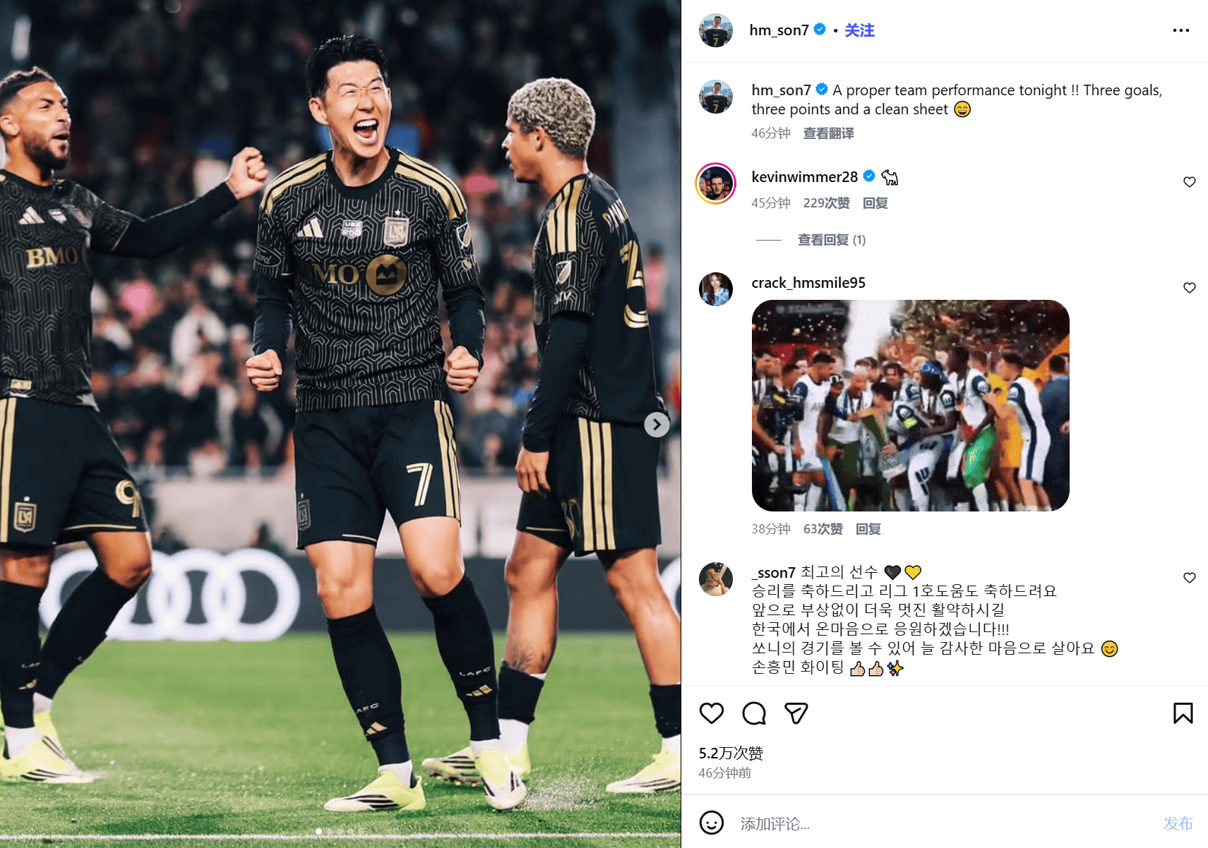 赛后,孙兴慜更新了Instagram:今晚团队的表现堪称完美!三个进球,收获三分,同时保持零封。
