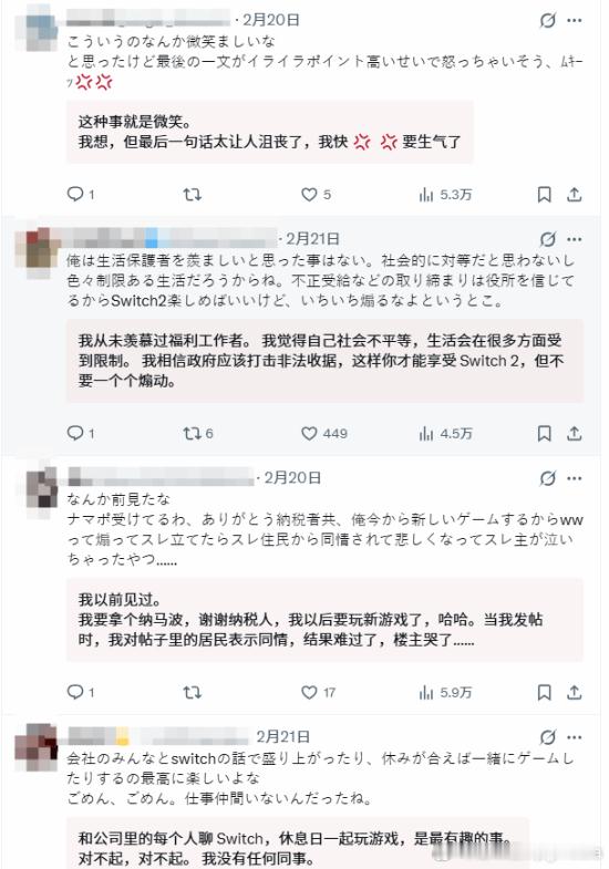 日本低保户炫耀购买NS2引众怒2026 年 2 月 20 日,日本社交媒体用户 kanda(Switch 2,并配文 “虽然我是生活保障受领者,但还是买了 Switch 2~谢谢,纳税人”。该推文发布后迅速发酵,点击量超 1300 万,引发日本社会对生活保障金使用边界的广泛讨论。据了解,kanda 在推文中明确标注自己为生活保障受领者,同时展示了全新的 Switch 2 包装盒。这一行为迅速引发网友争议,部分网友认为,生活保障金应优先用于基本生活开支,购买高价游戏机属于滥用福利;也有网友表示,福利制度应兼顾生活品质,低保用户有权享受合理的娱乐消费。在评论区,网友观点呈现明显分化。有网友质疑 kanda 是否存在隐瞒资产或收入的情况,呼吁相关部门加强监管;也有网友表示,只要符合福利领取规定,就不应过度苛责个人消费选择,“用自己的钱买,心里开心就好”。kanda 本人也在评论区与网友互动,强调自己只是想分享快乐,并未滥用福利。