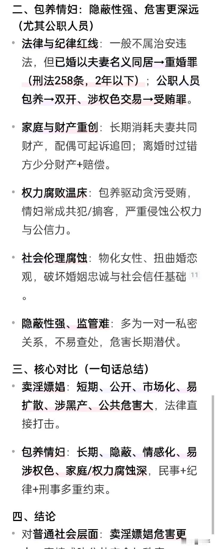 卖淫嫖娼和包养情妇,哪个对社会的危害性更大? 绝大多数法律方面的专家学者一致认为嫖娼对社会的危害性更大。 他们给出的理由是,这种行为十分不道德,是一种违法的卖买行为,由于是非特定人群间的金钱交易,因此存在巨大的卫生健康安全隐患。 与此相反,包养小三,甚至小四、小五…尽管也是不道德行为,但是由于该行为没有直接的金钱交易,且发生在固定人员之间,所以对社会的危害性反倒不是那么严重。 对此大家怎么看?
