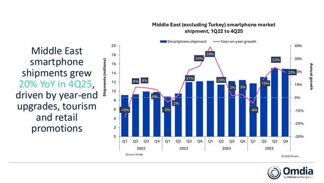 IT之家2月22日消息,Omdia在本月中旬的两份报告中指出,根据其数据统计,拉丁美洲与中东(除土耳其)智能手机市场在2025年均实现增长,出货规模分别达到1.405亿部和5480万部。