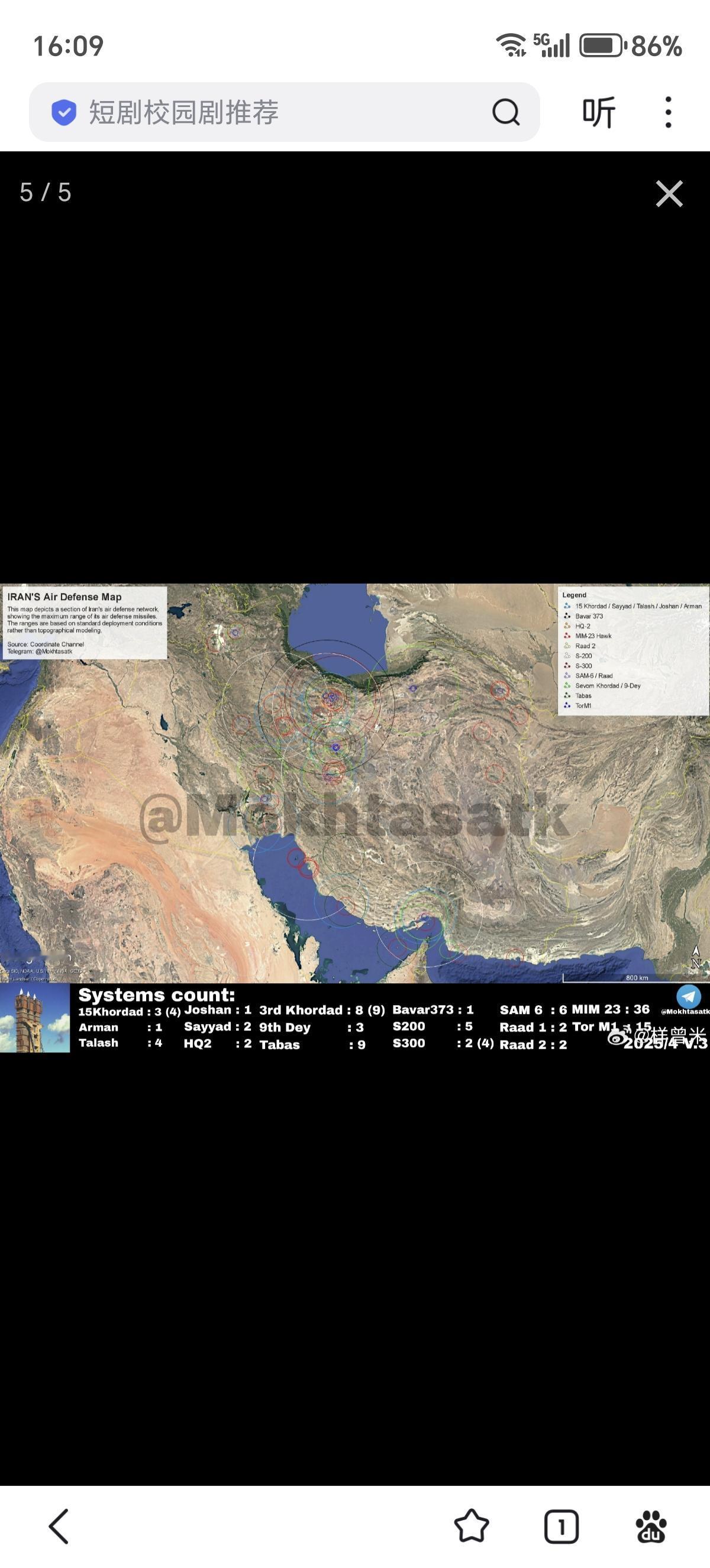 基于开源情报综合分析,在“12日战争”爆发前,伊朗伊斯兰革命卫队及防空部队的中高空、中远程防空系统部署态势如下:其装备序列主要包括:约3至4个营的“三月十五”、1个营的“巴瓦尔-373”(被认为是国产版S-400)、5个营的S-200VE(其中实际战备部署仅为2个营)、9个营的“三月三”(实际部署8个营)、4个营的S-300PMU-2(实际部署2个营),以及9个营的“塔巴斯”防空系统(全部完成部署)。 就部署策略而言,伊朗将最精锐的防空资产集中于首都德黑兰核心圈。这包括其唯一的国产“巴瓦尔-373”系统,以及仅有的两个已部署的S-300PMU-2营。从态势图上看,伊朗南部地区的防空火力密度较弱,主力装备多为老旧的S-200VE。这种部局实质上构成了“重点保卫首都、适当兼顾边疆”的防御态势,将大部分战略预警与拦截力量集中在了靠近西部边境的德黑兰地区。 然而,在以色列发动的“12日战争”中,伊朗防空体系的诸多弊端集中暴露。在激烈且高强度的电子对抗环境下,包括S-200、霍克以及“萨姆-2”和“萨姆-6”在内的各型老式装备表现不佳。由于系统设计陈旧,且面临备件短缺、年久失修导致的妥善率低下等问题,其制导雷达在遭到强烈压制干扰后,无法为导弹提供稳定的上行指令或目标照射。大量发射升空的导弹在飞行末段因导引头无法捕获目标而失控,最终坠毁,未能对来袭目标构成实质威胁。 战争期间,以色列空军(IAF)运用无人机和远程精确打击弹药,对伊朗的战略预警核心实施了点穴式打击。重点目标直指“巴瓦尔-373”配套的相控阵雷达,以及S-300系统的远程对空搜索雷达(如64N6E或96L6E)。根据现有情报,这些关键的相控阵雷达遭受重创后,至今未能修复,且伊朗国内尚不具备完全的自主维修能力。因此,“巴瓦尔-373”及S-300系统目前基本处于失效状态。 以色列方面宣称摧毁了伊朗约70套各型防空系统。而根据后续网络流传的交战视频统计,可明确识别并证实被击毁的防空系统已超过10套,其中大部分为“三月三”和“三月十五”这类构成其中远程防空骨干的型号。尤为严重的是,伊朗部分宝贵的反隐身雷达与有源相控阵雷达也被确认摧毁。 那么,作为“抵抗之弧”核心成员的伊朗,其空情获取能力究竟还剩几何?