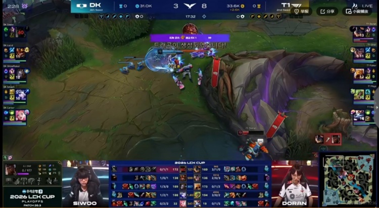 [17:35]上路Doran兰博找到机会,直接对位单杀掉了Siwoo奎桑提,TP落地的SMK许哥终于拿到了击杀!不过正面拿下先锋的T1已经带着先锋几乎拆掉了对手的中路双外塔!双方经济差被扩大到快4K了!T1还可以拿下第二条小龙!
