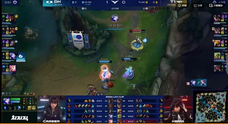 [7:12]DK下路组抓住Keria悠咪落地的机会直接给上控制和输出,两人合力线杀掉了Keria悠咪!Smash艾希一血!