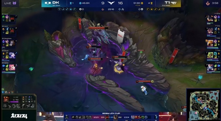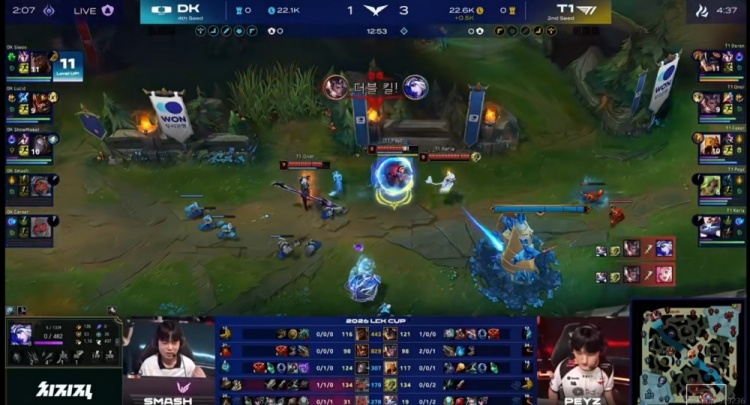 [23:02]Smash艾希一箭命中上路的Faker沙皇,配合发条大招+Lucid皇子gank将他强杀!回头T1一路追击留住Lucid皇子,但是自家赵信被击杀,残局Peyz泽丽带猫还想打,但哪怕换掉了Smash艾希,两人都被Siwoo奎桑提贴脸逮捕了!Doran兰博支援大招没击杀掉发条!这波DK打出2换4!