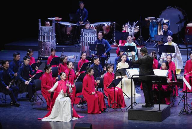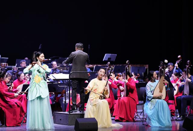 当晚,乐团驻团指挥姚申申执棒登台,带领乐团呈现了一场中西交融、古今碰撞的音乐盛宴。当《春节序曲》的熟悉旋律如春潮般席卷全场,清脆的锣鼓声、悠扬的弦乐声交织在一起,瞬间将现场氛围点燃。随后,陈晓雁、李胜男、高雅三位演奏家以器乐重奏搭配乐队,奏响《江南》一曲,丝竹婉转、清越悠扬,如春雨润田般流淌出新春的温润与柔美,将江南水乡的灵秀与新春的祥和演绎得淋漓尽致。民族管弦乐《凤阳花鼓》节奏明快、喜气洋洋,明快的鼓点搭配悠扬的旋律,仿佛敲开了家家户户的团圆之门,传递出辞旧迎新的喜悦。