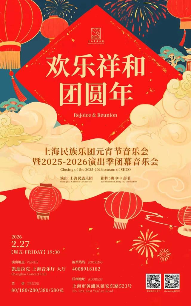 系列音乐会的收官之作——《欢乐祥和团圆年》元宵节音乐会,将于2月27日(正月十一)晚在上海音乐厅上演。作为乐团2025-2026演出季的闭幕音乐会,本场演出将由驻团指挥姚申申、彭菲联袂执棒,以团圆为主题,邀观众共赏一轮“音乐明月”,在欢乐祥和的国乐声中,为整个演出季画上圆满句号,也与市民共迎一个团圆美满的元宵佳节。