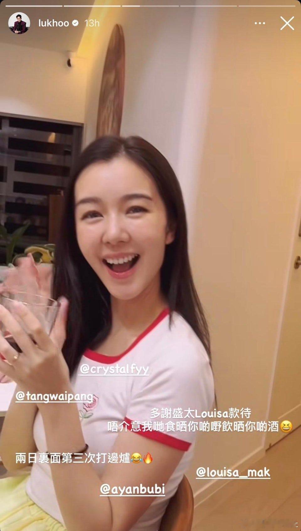 麥明詩一家人與馮盈盈、陸浩明打邊爐,又肉又酒又菜。馮盈盈戴上LV白色Cap帽拜年,一邊飲嘢一邊打招呼,省貴又富貴。陸浩明發文:「多謝盛太Lousia款待 唔介意我哋食晒你啲嘢飲哂你啲酒 兩日裏面三次打邊爐」。