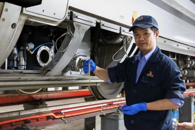 当晚8时28分,该趟复兴号动车组列车驶入南宁动车所检查库,地勤机械师严芝科和搭档张浩早早就备好了工具材料,等候在一旁。