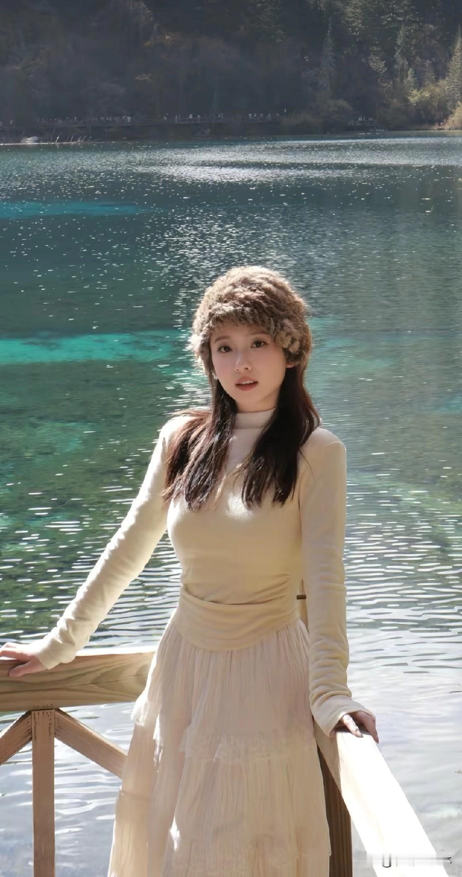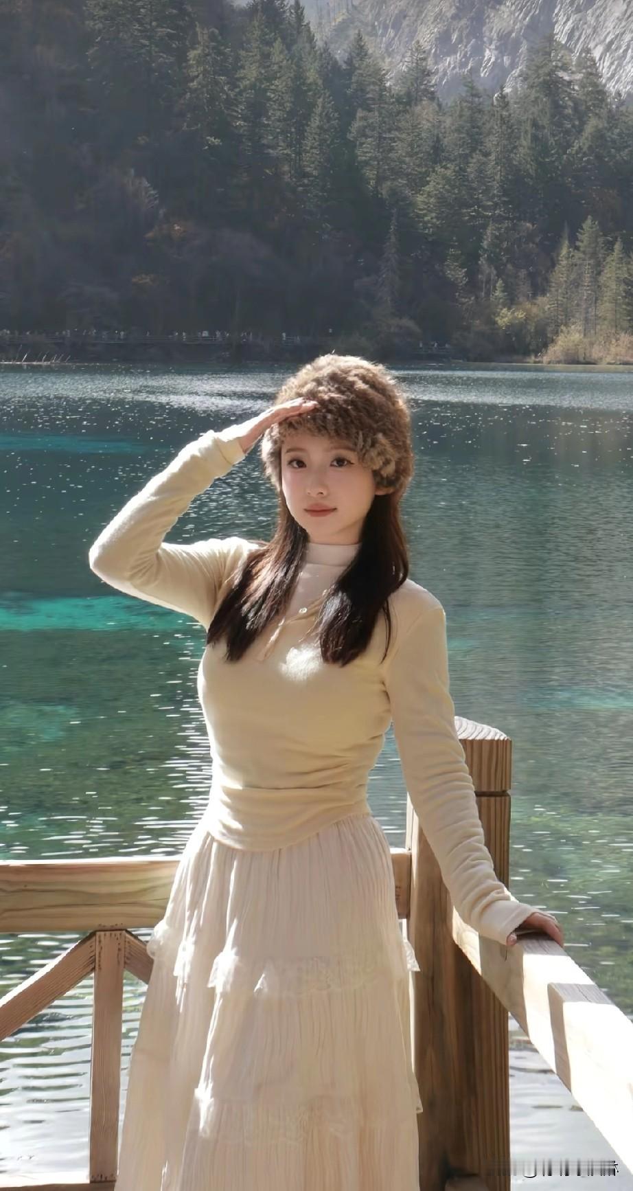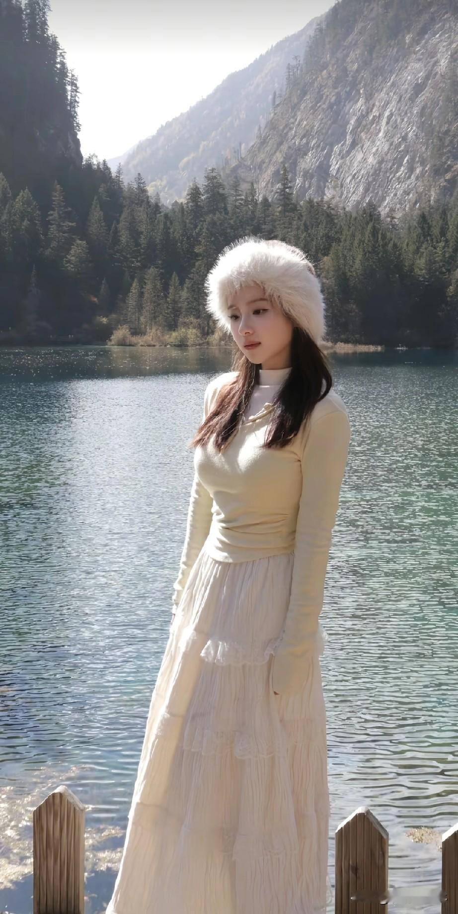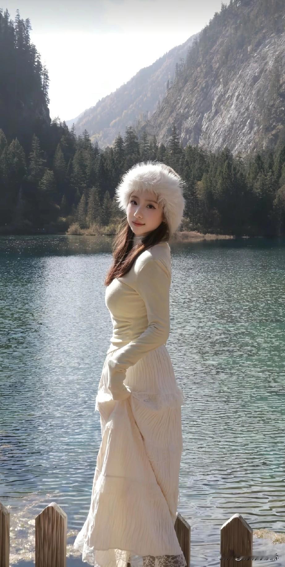 冬日湖畔,温柔白裙与毛绒帽子的完美搭配,静谧自然,宛如童话中的仙境。