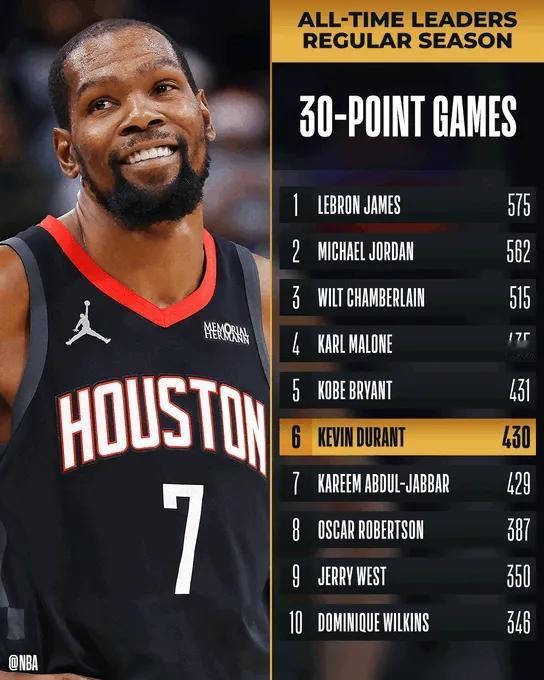 历史30+场次排名更新: 1、詹姆斯:572场 2、乔丹:562 3、张伯伦:516 4、马龙:435 5、科比:431 6、杜兰特:430 7、贾巴尔:429 杜兰特目前距离追平科比仅剩1场,而过去几个赛季,杜兰特平均每个赛季都有20次30+表现,本赛季来到火箭后,防守任务大减,进攻的戏份更重,至今已经有20场单场30分,到赛季末依然有机会再拿10次甚至更多。 按照这个速度,杜兰特再打两三年,就有机会超越张伯伦直追乔丹,当然,前提条件是在火箭扎住根,有队友强力的防守保障,这才能给杜兰特足够的输出空间,即便是上了年纪,也能尽可能轻松的去完成得分。 如果还是打两年换个地方,那对杜兰特而言,再拿30分,就不太容易了。
