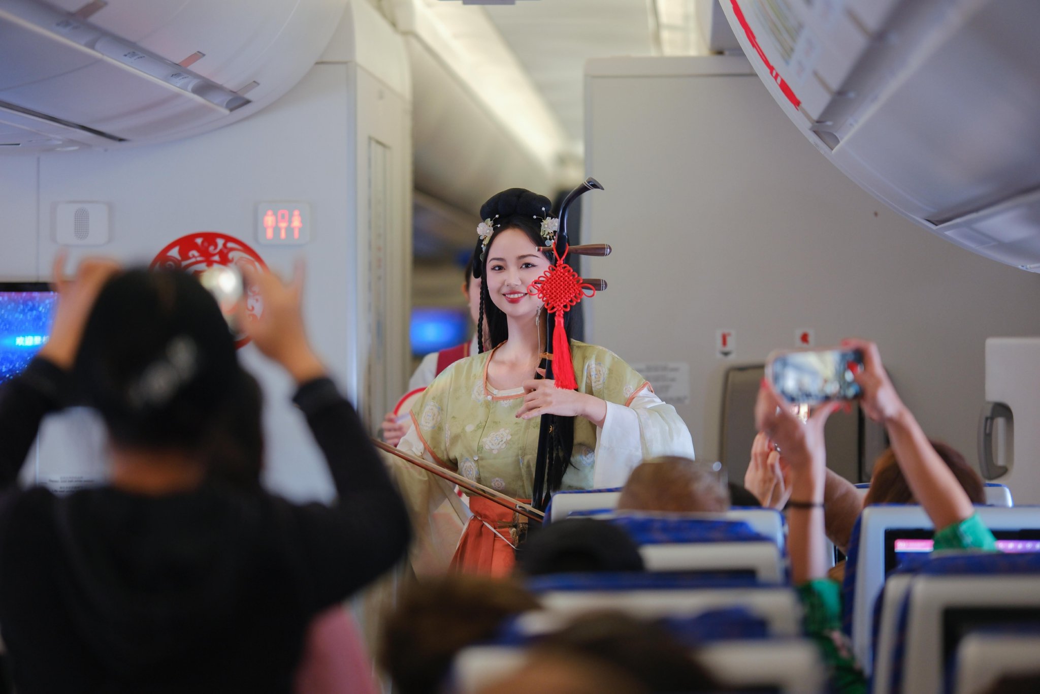 2月17日,南航CZ307航班上,一场融汇国风器乐、汉服雅韵与新春民俗的文化盛宴精彩上演。悠扬二胡、清越古筝穿越云端,经典旋律回荡客舱,中外旅客同赏国乐、共庆新春。客舱内福字迎春、年味浓郁,处处洋溢着喜庆祥和的节日氛围。