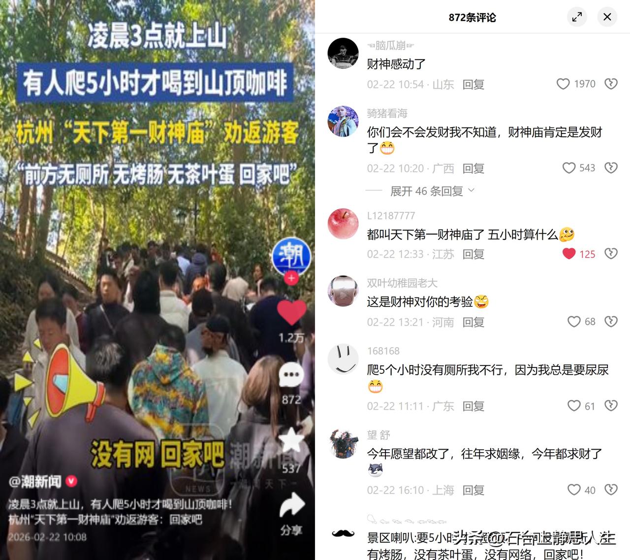 杭州财神庙凌晨3点挤爆! 正月初五迎财神,杭州天下第一财神庙直接挤疯了!凌晨3点就有人摸黑上山,全程没厕所没补给,10分钟才挪5步,硬生生熬5小时才到顶。景区拿大喇叭喊“无厕所无烤肠无网,回家吧”,结果大家反而觉得这是财神的考验,越劝越要上! 说真的,我看着都替这帮人憋得慌、累得慌!但转头一想,这不就是咱们当下年轻人的真实写照吗?往年挤破头求姻缘求脱单,今年全改成求发财,为啥?还不是因为这年头赚点钱太特么难了! 你以为大家真的是迷信?错!这是在不确定的生存压力下,抓着努力就有回报的最后一点执念啊!5小时的苦不算什么,比起房贷车贷房租的压力,比起努力了还看不到头的焦虑,这点考验算个屁! 再说了,景区这反向操作也绝了,本来是劝返,结果反而坐实了心诚则灵的噱头。财神爷忙不忙我不知道,景区的钱包肯定先鼓得不行了! 唉,说白了,与其说是拜财神,不如说是拜自己那点想好好活下去、想多赚点钱的朴素心愿!你们今年的愿望,是求财还是求啥?