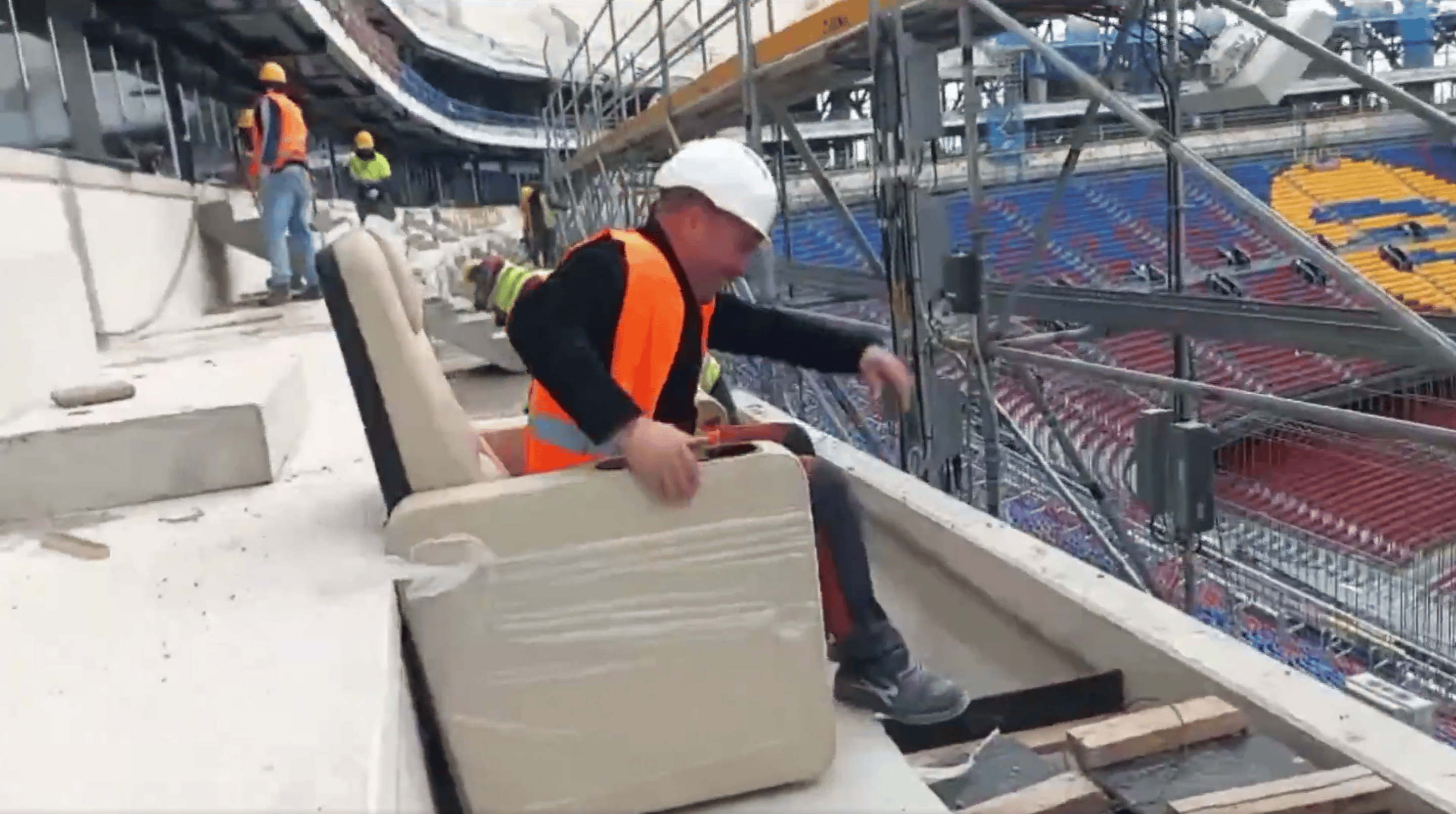 此外,视频还曝光了位于第二与第三层看台之间的新VIP环形看台。此前已有部分照片流出,此次画面显示施工人员正在测试新座椅的舒适度。巴尼奥尔还拍摄到工作人员正在完成新包厢内部区域的地面铺设工作。