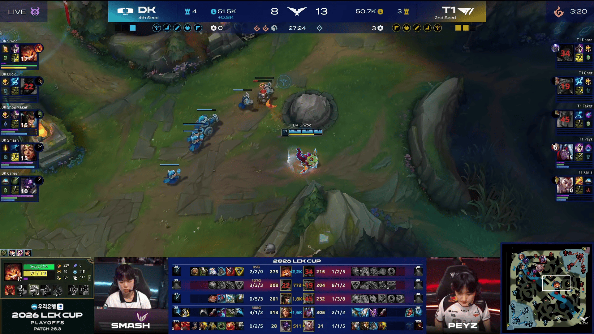 比赛第27分钟,T1小龙团打出0换2随后开打大龙,但DK打出1换3守住大龙→