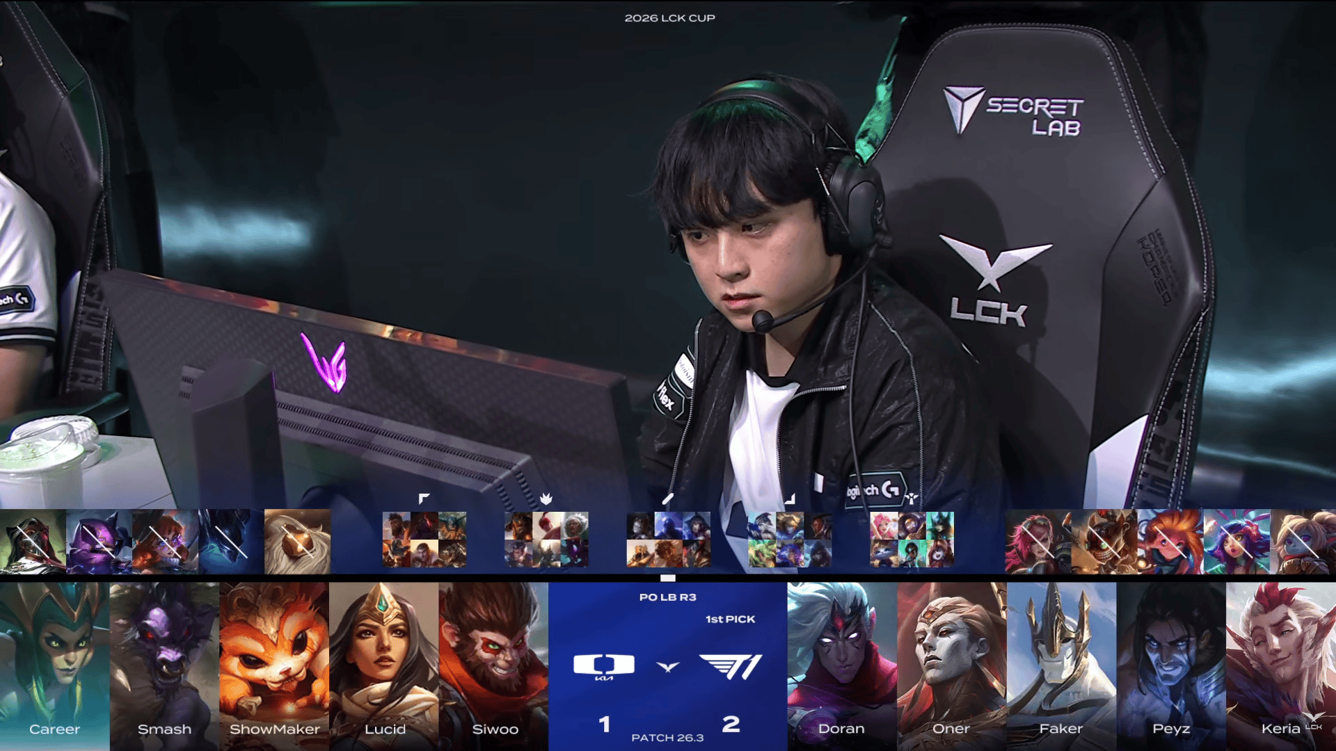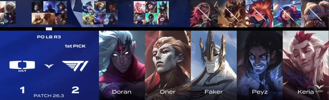 T1选用:Doran塞拉斯、Oner亚恒、Faker加里奥、Peyz韦鲁斯、Keria洛