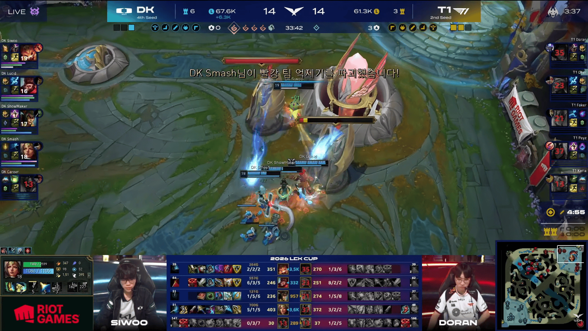 比赛前期,Oner亚恒打出5/0/1的战绩帮助T1打出7-1的开局。但此后DK不断扳回局势。T1