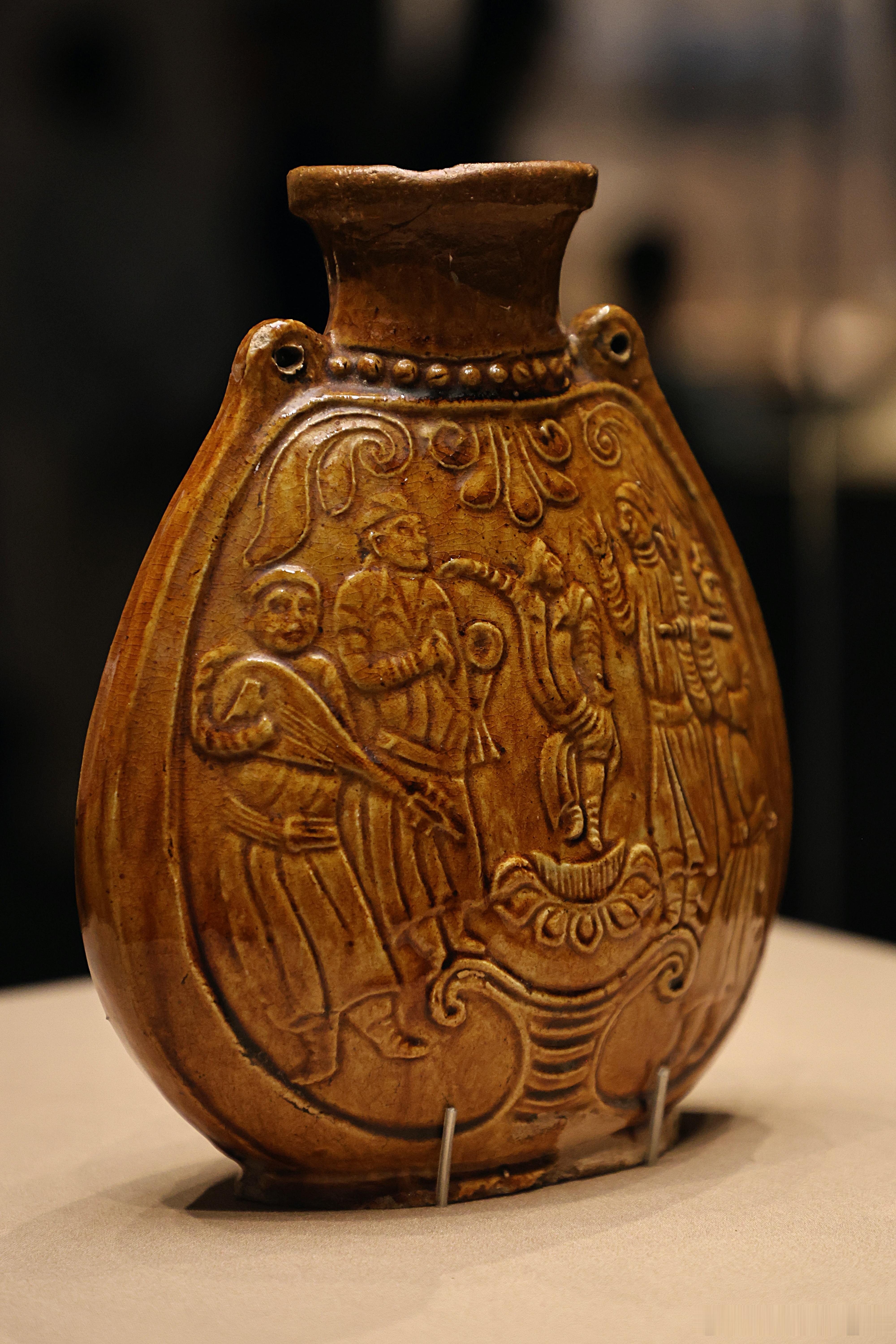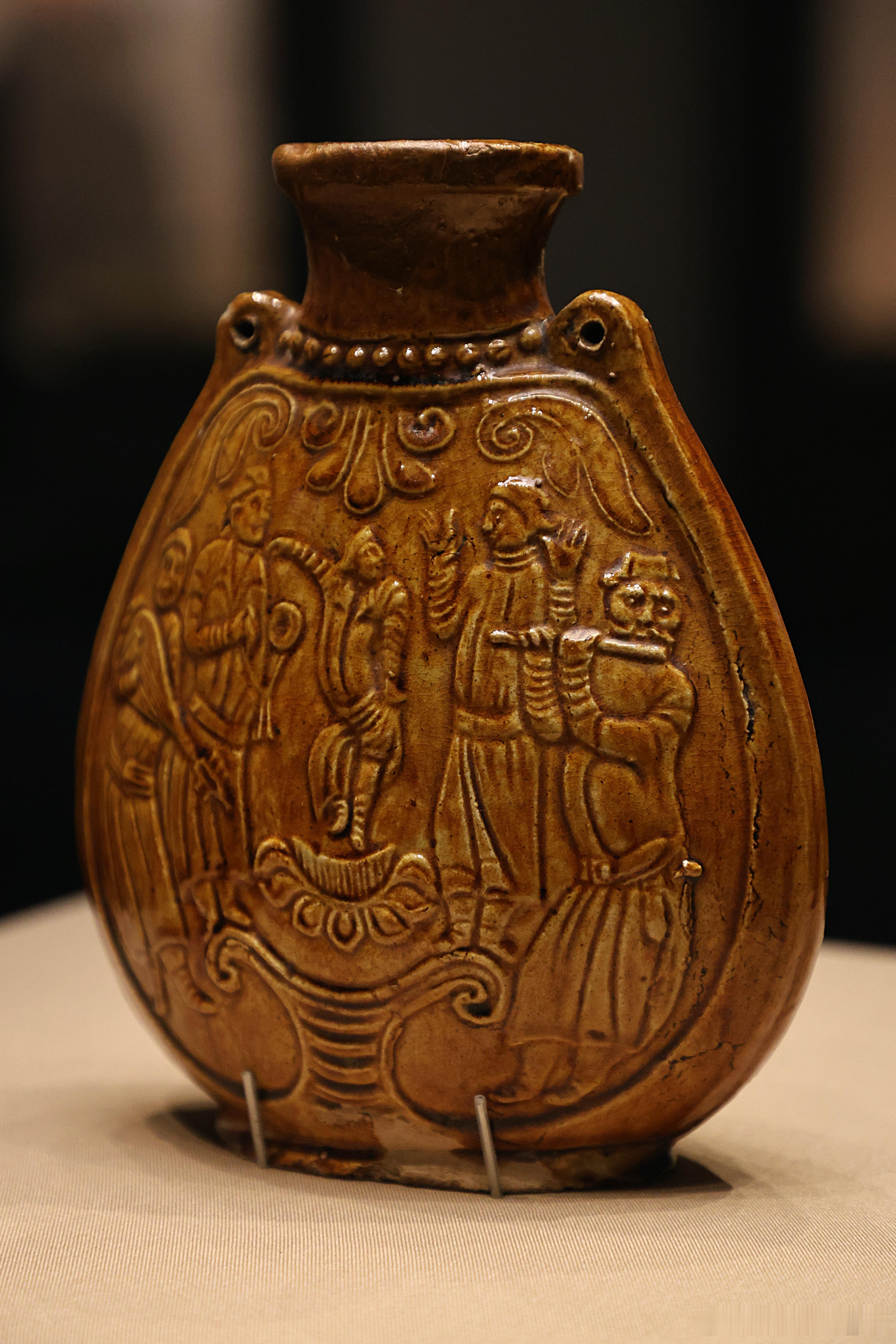 我的2026 【中国之中-中原古代文明精粹】黄釉双系扁壶北齐武平六年(公元575年)河南博物院藏安阳范粹墓出土。造型仿自游牧民族常用的皮囊壶,扁圆而丰满颈微束,腹体浑圆,平底实足,两侧设系耳。壶腹两面模印乐舞场景,舞者位于中央,两侧伴奏者或击、或吹、或弹,五人皆为西域相貌,高鼻深目,头戴蕃帽,身着窄袖长衫,足蹬高靴,形象鲜明。清华大学艺术博物馆展出2026.2.8约会博物馆文物