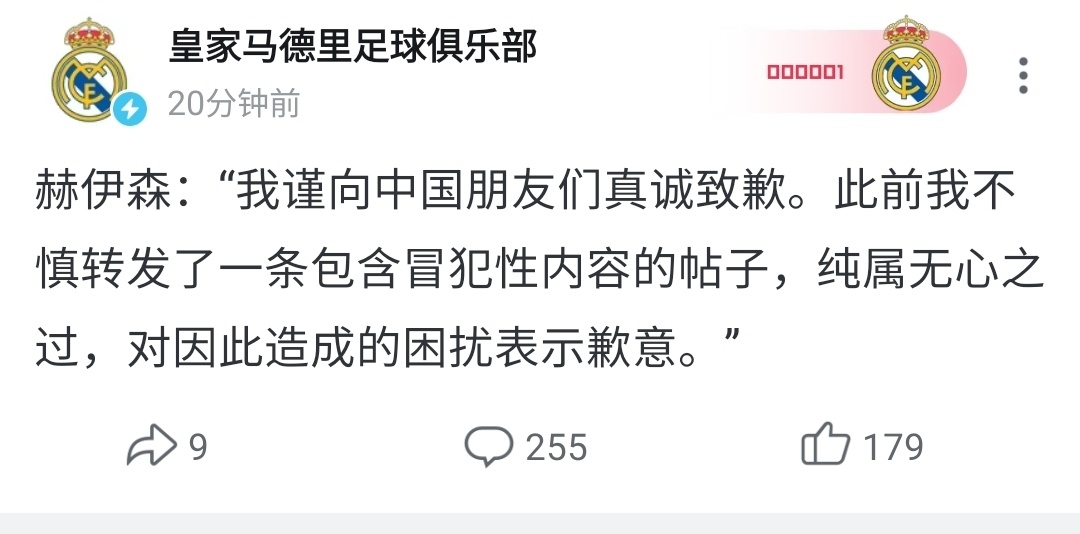 虎扑02月22日讯皇马球员赫伊森此前就误转含有冒犯性种族歧视内容的帖子致歉,但目前其道歉声明仅发布于中国的微博及B站平台。