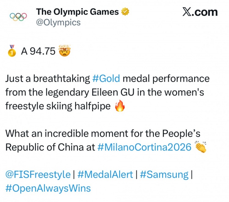 国际奥委会祝贺谷爱凌:“94.75分…刚刚传奇选手谷爱凌在U型场地为我们献上精彩绝伦的表现,对于中国队而言,这是多么激动人心的时刻!”