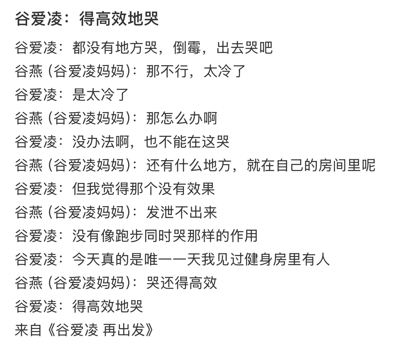 谷爱凌真的是赛级intj哭得高效的哭,在跑步机上哭休息的方式可能是深呼吸三分钟,可能是跑8公里,可能是睡一觉,可能是吃一顿好(车上吃也算)