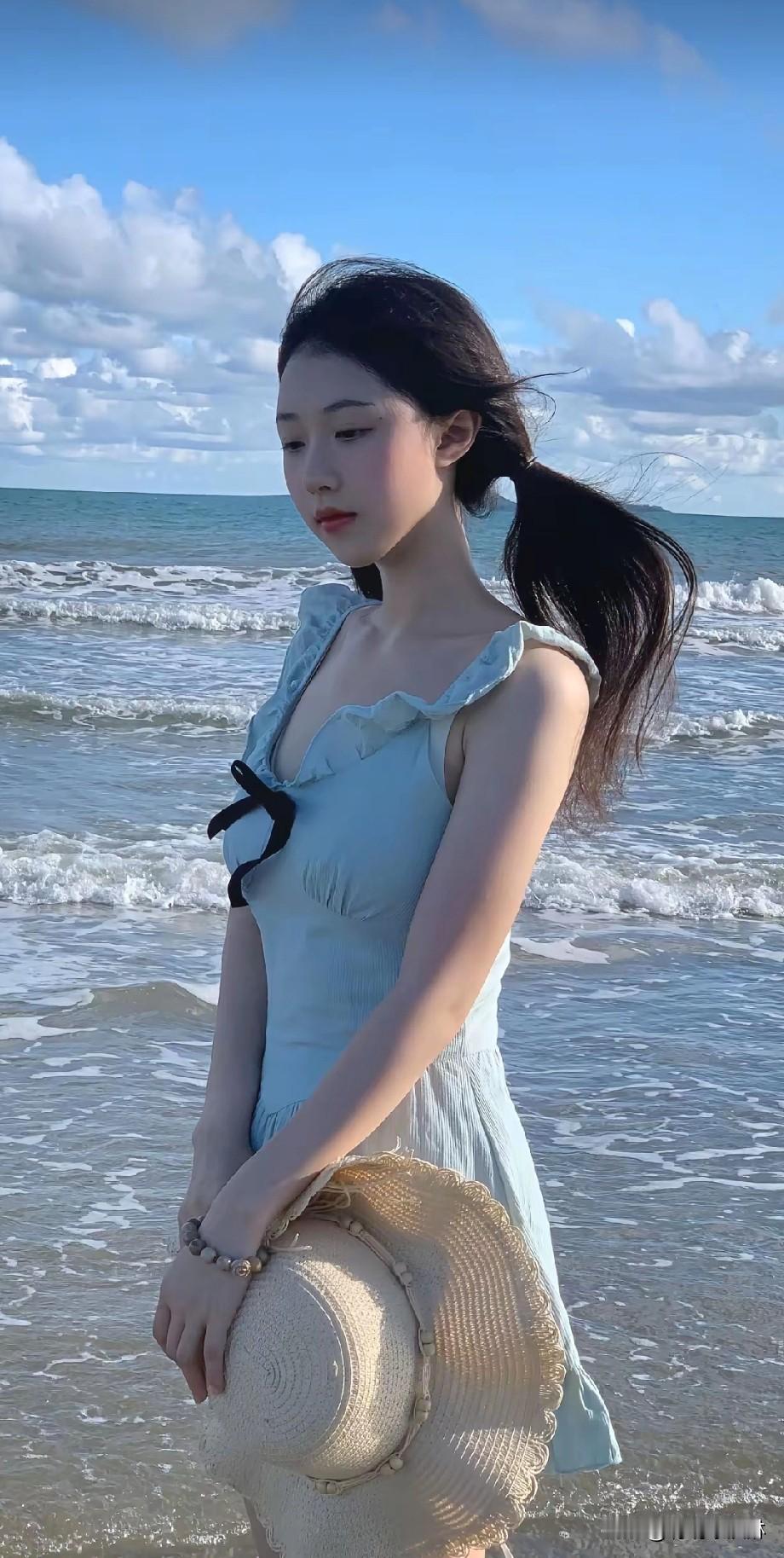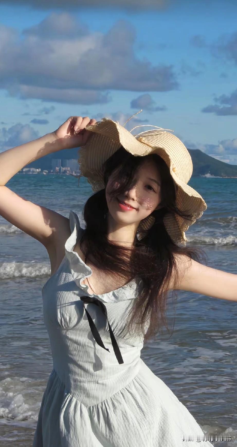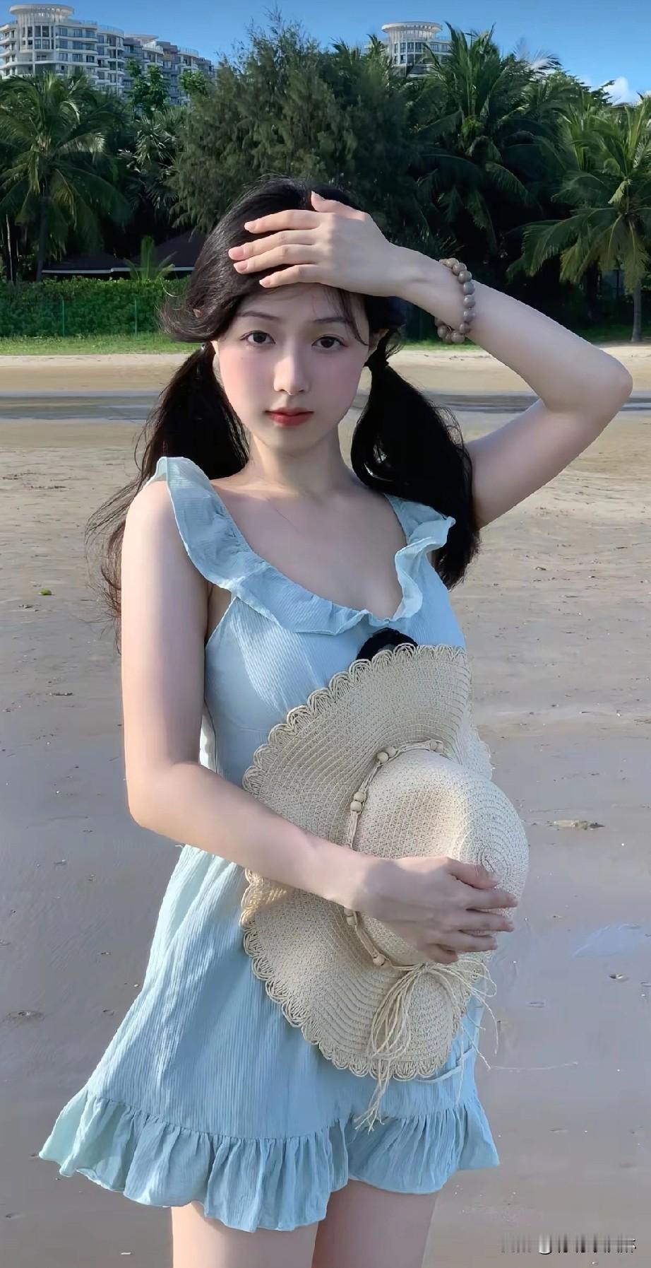 夏日清新穿搭,草帽+蓝裙,度假风满满!