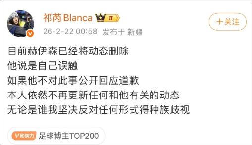 长期报道马德里足球的记者祁芮表示:“目前赫伊森已经将动态删除,他说是自己误触。如果他不对此事公开回应道歉,本人依然不再更新任何和他有关的动态,无论是谁我坚决反对任何形式的种族歧视。”