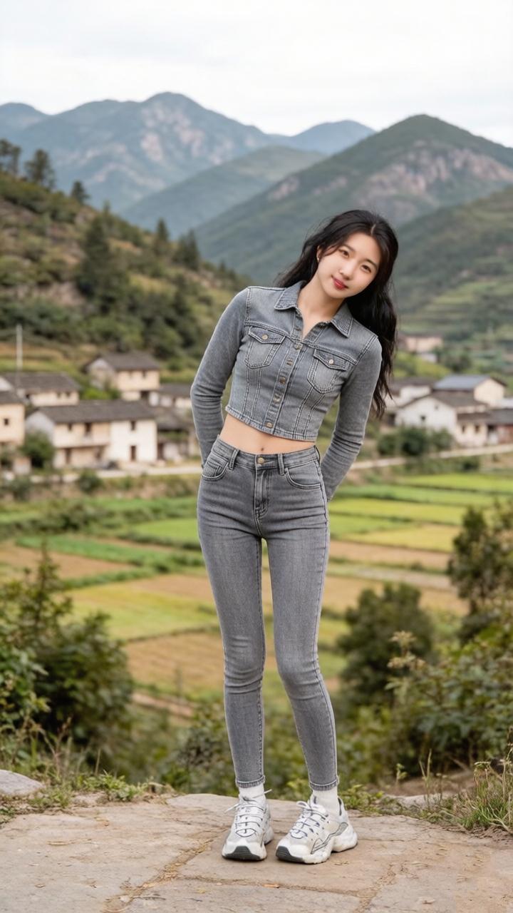 这位姑娘站在山间风景里,好美啊!