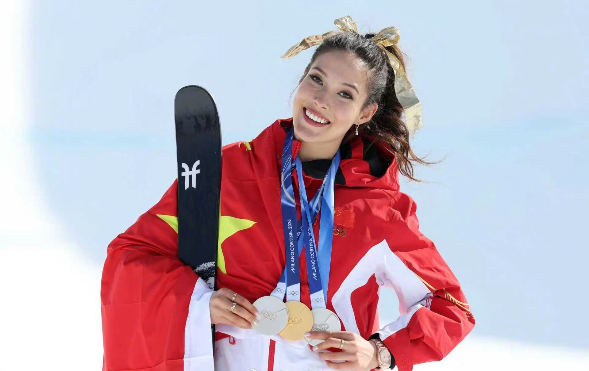 谷爱凌两届奥运会都身兼三项,参加的6个项目全部登上领奖台,奥运夺牌率100%,收获3金3银,成为自由式滑雪(含男子)史上金牌数、奖牌数第一人。