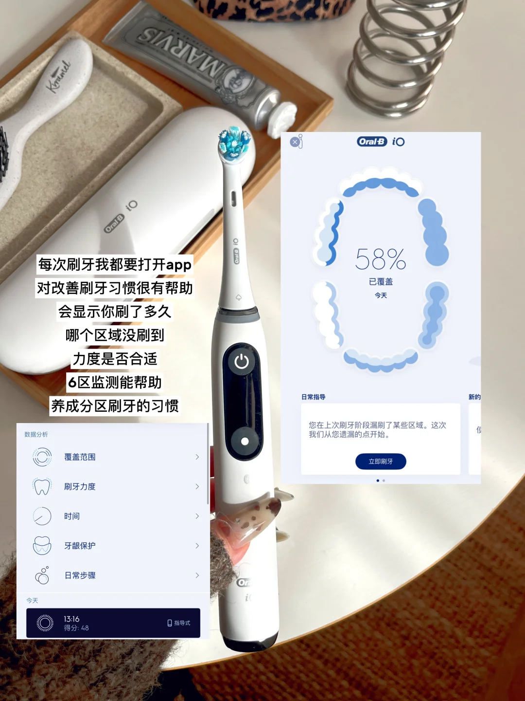 它是这种圆形刷头的,能360°包裹住每颗牙齿贴着牙龈线去刷,连后槽牙、最内侧的大牙背面这些犄角旮旯的地方都能清洁到,刷完的洁净感是之前从未有过的——牙齿表面摸起来光滑多了,也抠不出白泥了。它还搭配了app,自动划分6个口腔区域,每个区域有没有漏刷、有没有刷干净都能在app上查看到!刷满2分钟还会出现鼓励笑脸,情绪价值给足!