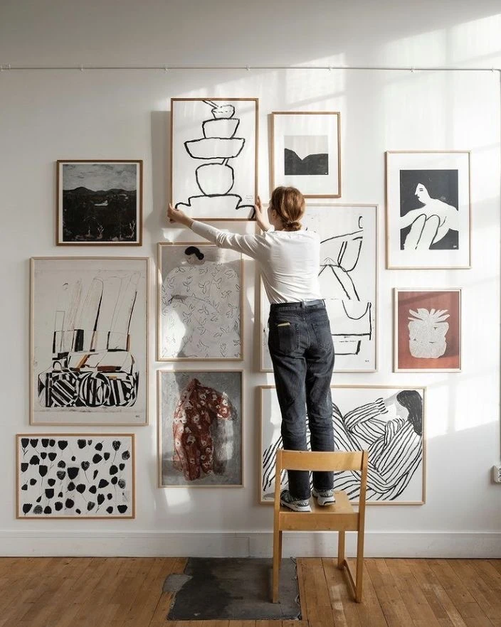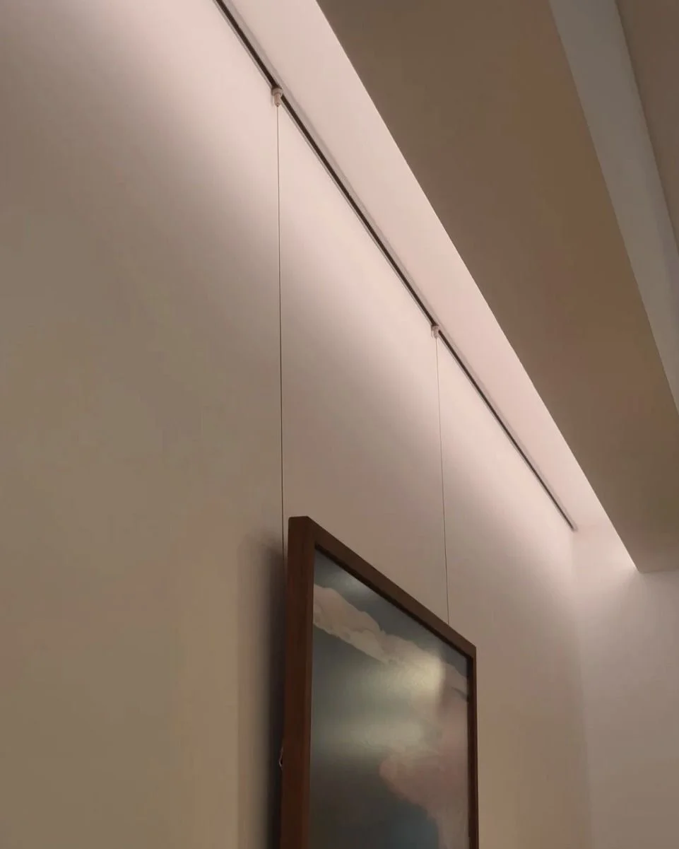 如果你也想挂画,但又不想在墙上打钉子, 不如看看我业主的家, 直接实现挂画自由~ 挂画轨道只需要在墙顶的两端打几颗钉子, 再用透明尼龙绳和挂钩链接起来就可以了, 用就可以随调整挂画的位置了,还可以随意更换不同的画框, 如果你有很多喜欢的挂画, 还可以高高低低、大大小小的错落摆放, 一秒变身美术 部分图源:Pinterest