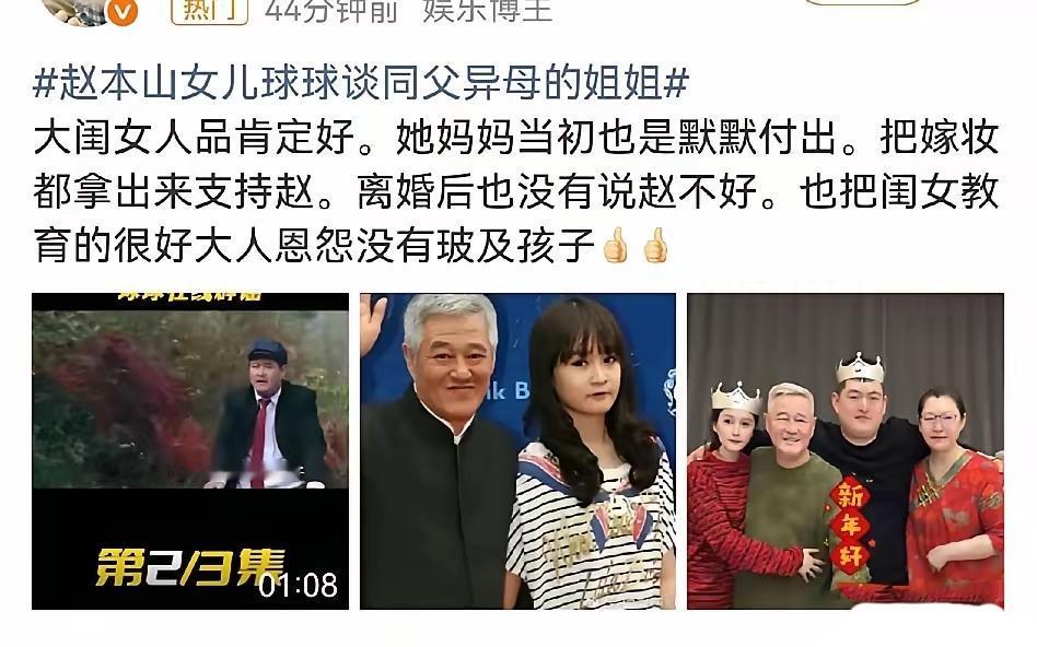赵本山女儿冲上热搜! 2月22日下午,赵本山女儿球球,突然冲上热搜,原因在直播时,球球说起了同父异母的姐姐赵玉芳,几句话真诚又戳心。她直言姐姐性格低调,不想被外界打扰,自己不公开提,不是关系不好,而是用心守护姐姐的平静生活。 很多人总觉得,重组家庭必有矛盾,星二代更是争宠不断。可赵家偏偏打破了这个偏见。姐妹俩私下相处融洽,回老家就热热闹闹相聚,父亲对孩子一视同仁,没有偏心,更没有隔阂。 最难得的是老一辈的体面。前妻葛淑珍当年全力支持赵本山,分开后也从不说一句坏话,安安静静把女儿教得稳重懂事。大人有分寸,孩子懂珍惜,这样的家风,比多少财富都珍贵。 比起豪门里的勾心斗角,这种互相尊重、彼此守护的亲情,才最让人羡慕。