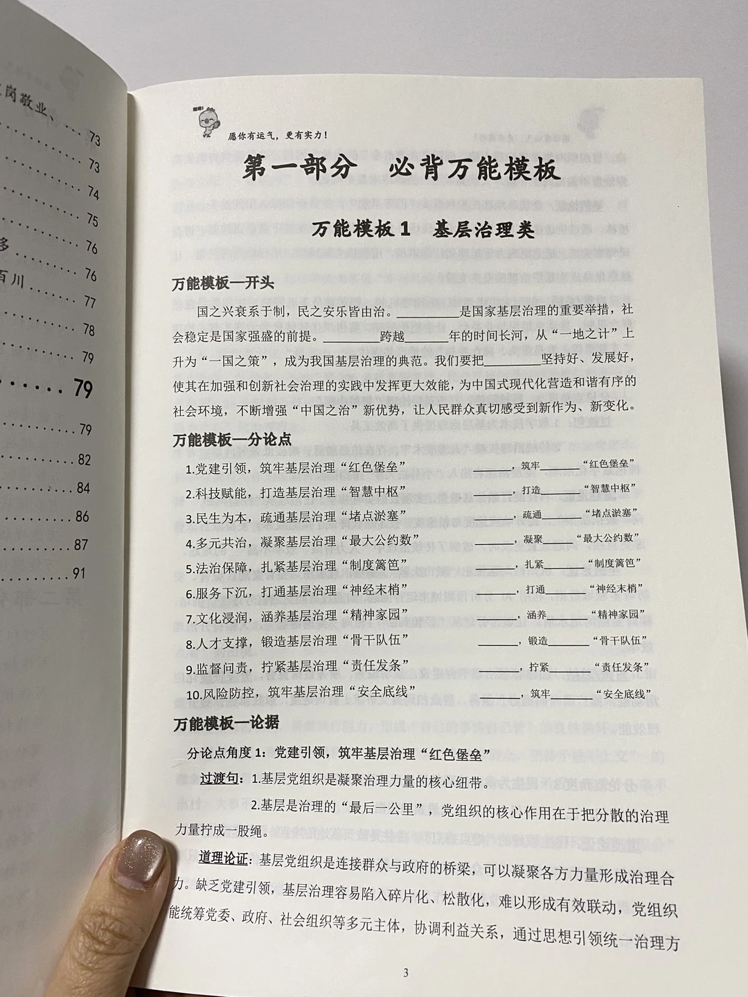 申论大作文发愁不会写,但很想短时间就看到效果,能写出成型文章的同学,给大家分享一个四步走法哈,大家可以尝试一下: [红色心形R]第一步 找到万能模板中的分论点和标题,分别挑选3-5个优化框架,给考官留下一个好印象。 ❤第二步 积累一下下13个不同话题的万能模板开头和结尾,这样面对考场上的大多话题,都是能够写的出来的。 ❤第三步 指南的第一部分,每个话题分别积累3-5句话的论据,和3-5句话的对策,以及指南的第二部分,积累3-5个经典的,可以多话题应用的人物案例。 ❤第四步 随便找一个历年作文的真题,开始下笔去写,写出来以后,哪里有问题,再借助第一部分和第四部分内容,进行填充优化,坚持写上几篇,会有很大的变化的!