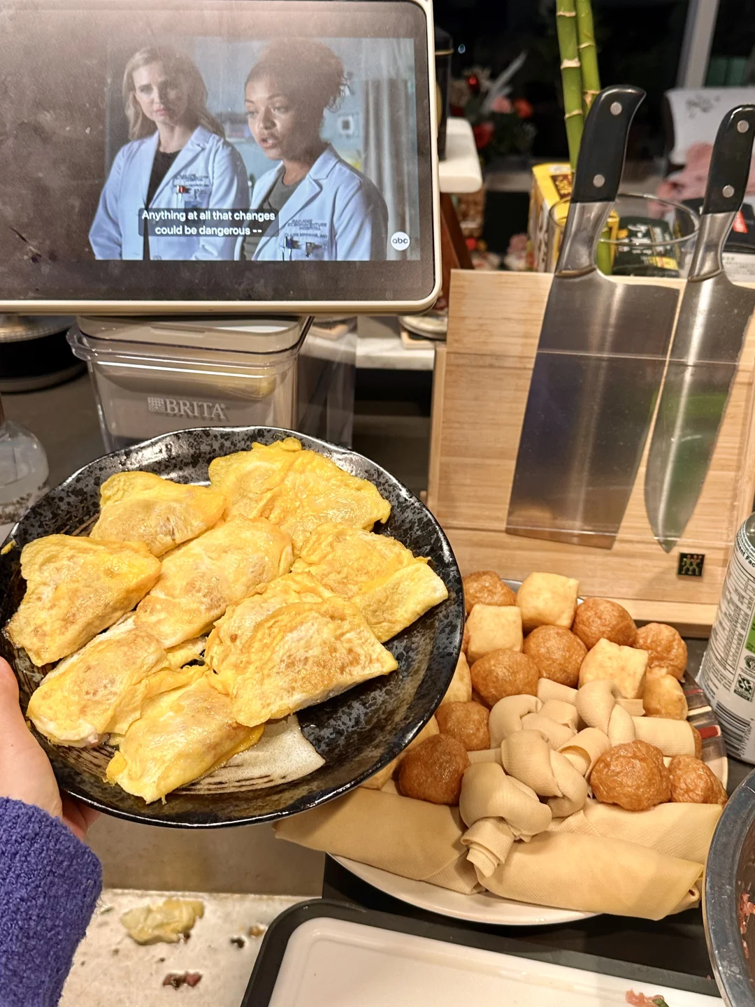 周二一边看the good doctor,一边做蛋饺,塞百叶包肉油面筋塞肉,感觉自己像个“food surgeon”😂可能是美剧里的外科医生给我动手能力一些加持,没了国内家里的大汤勺,竟然也煎出了还算像样的蛋饺;