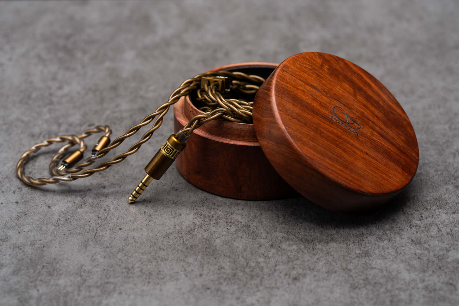 焦尾的线身是比较正的棕黄色,五金件和插头带有“国风”的设计语言,也和别家升级线在外观上实现了“一眼区别”,尤其是精致的金属镂空分线器在视觉上给整体增色不少。整根线重量较轻,弹性较弱,线身柔软,收纳半径很小。值得一提的是焦尾标配的黄花梨木质收纳盒,除了原木质感强烈外,做工精细度和内部容积也令人称赞,可以轻松连线带耳塞一起装进去。我群里有烧友说焦尾这是真·买椟还珠,侧面可见这个盒子很讨人喜欢。焦尾的定价是3598元,对应搭配的耳塞价格我觉得以3000至10000多元为宜,除了搭配自家耳塞外,也应该对第三方品牌的耳塞产品有一定的适配性,才能称得上一款合格甚至优秀的升级线产品。