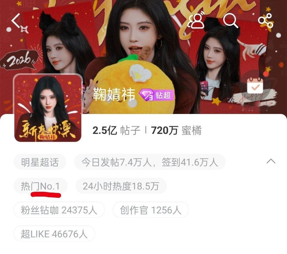 鞠婧祎超话目前热度值破140万了,已经远远超过钻3热度值,超话也上了热门第一,这活粉含金量