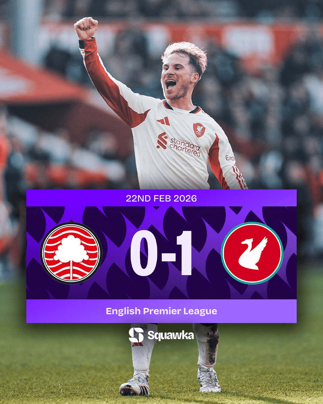 虎扑02月23日讯英超第27轮,利物浦凭借麦卡利斯特的补时绝杀在客场1-0击败诺丁汉森林。