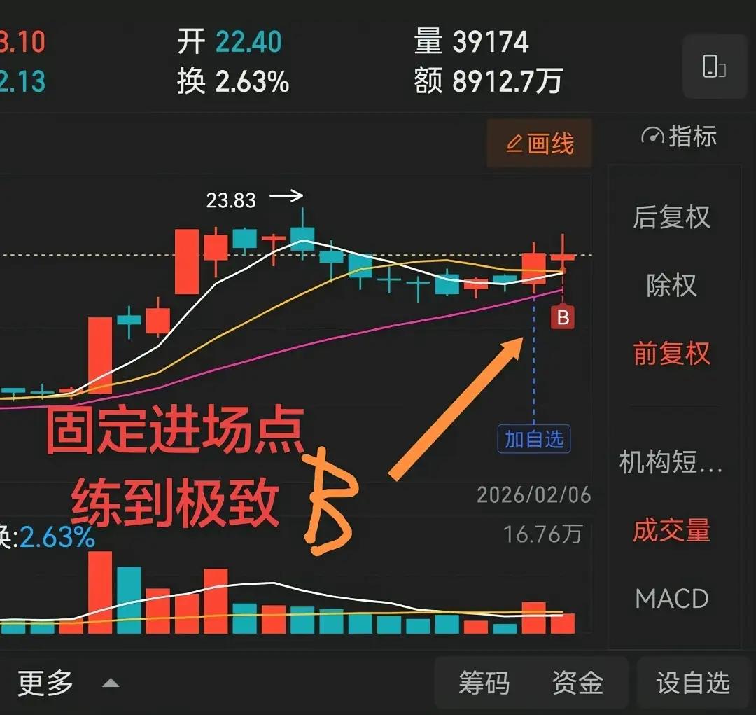 炒股想稳赢,别贪多求全,把一个固定进场点练到极致,比学十种模式有用得多。 关键逻辑: 1. 固定进场点=消除情绪:用明确量价/均线/形态条件(如回踩关键均线+缩量企稳放量+均线多头)当“瞄准镜”,符合条件就买,不犹豫。 2. 练到极致=形成本能:重复一个模式千次,熟稔细节(辨陷阱、设止损),最后“一眼定买卖”,胜率逐步提升。 3. 慢=快:拒绝频繁交易,只抓10%的确定机会,用“低吸企稳”替代追高,小亏大赚,靠确定性抗市场噪音。 结论:做“狙击手”而非“杂家”,把简单事做到极致,就是交易真谛。 (注:内容为经验分享,不构成投资建议,股市有风险。)