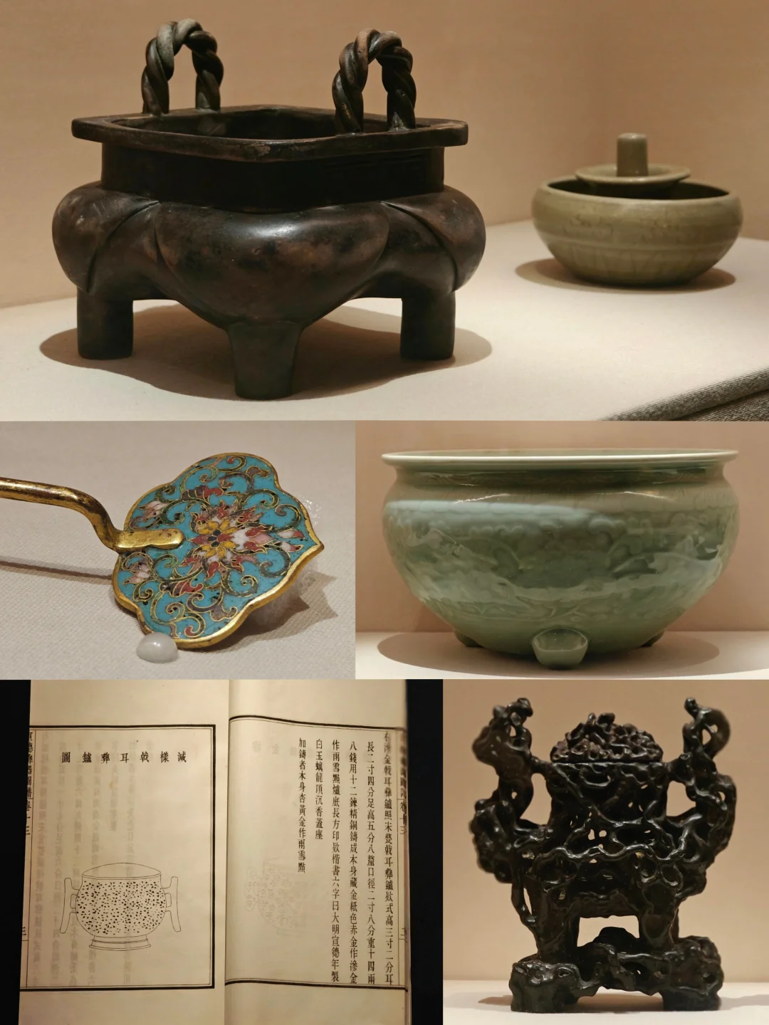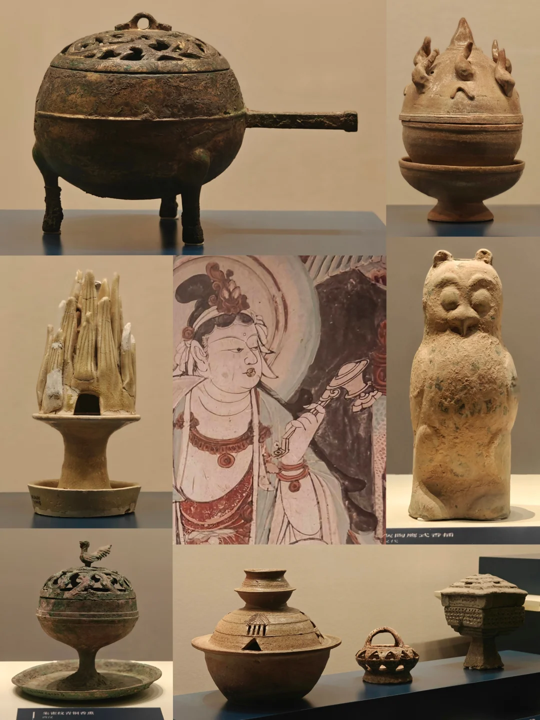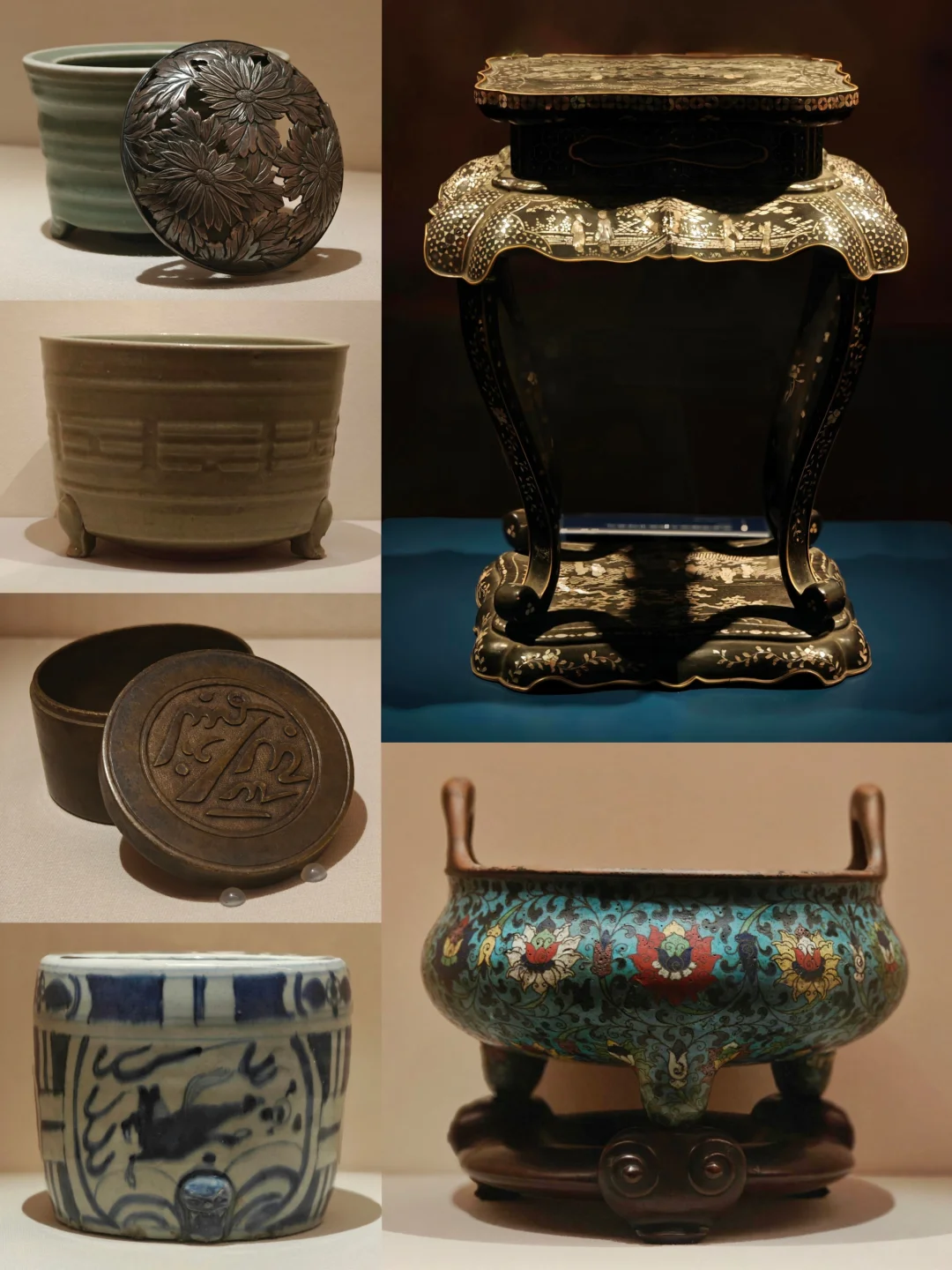 跨越千年的历代典型香具,包括汉代灰熊鹰式香插、汉代铜鎏金行炉、南北朝青釉博山炉、隋代瓷香薰、唐代铜荷花纹行炉、、元代青釉八卦纹香炉、明代金寿星骑鹿大香薰、清代青白玉龙钮兽面纹双凤耳四足炉、清代正德款阿拉伯文铜香盒等;另有与之搭配的香炉操持方式演变图。