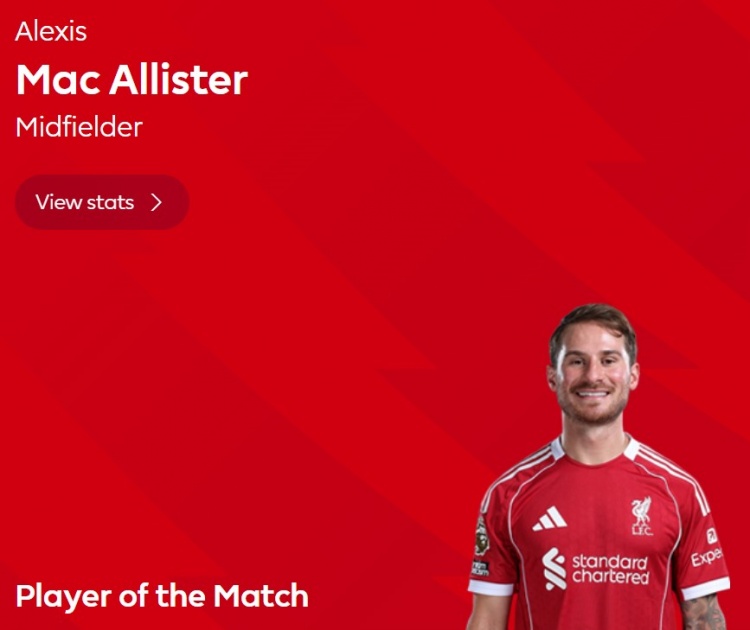 贡献绝杀!英超官方:麦卡利斯特当选利物浦1-0森林全场最佳