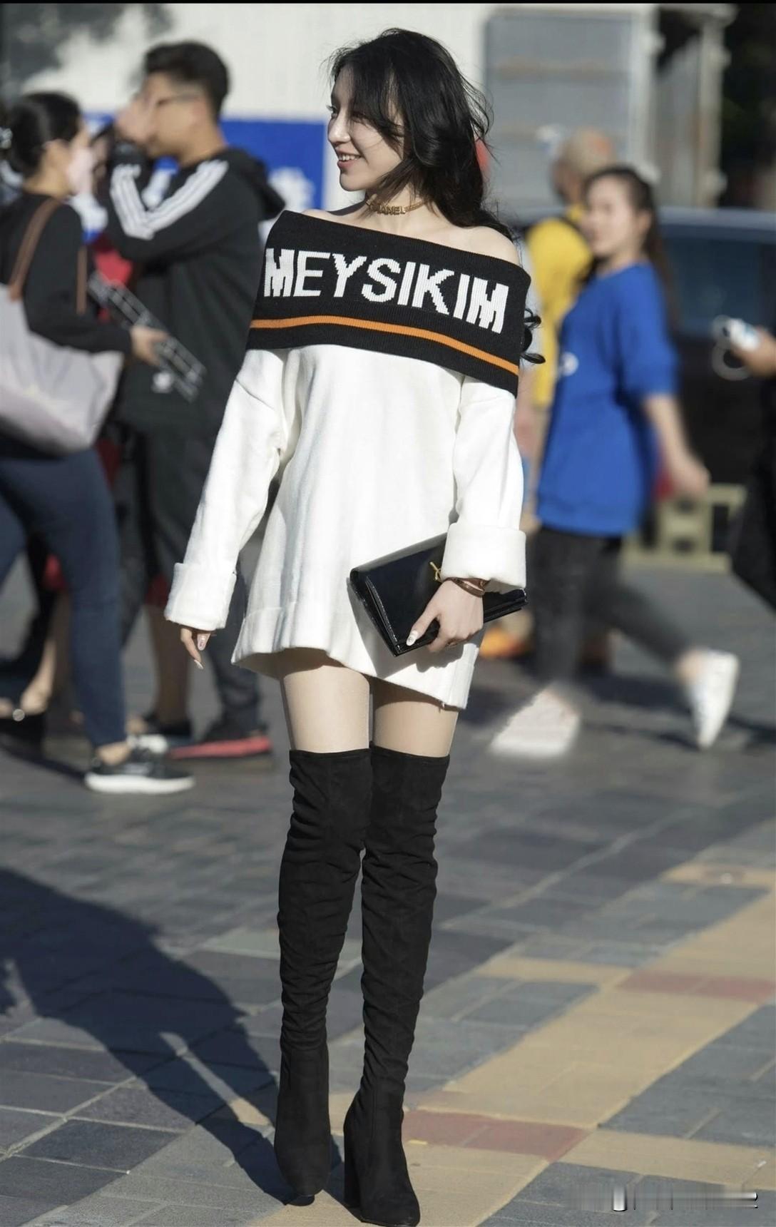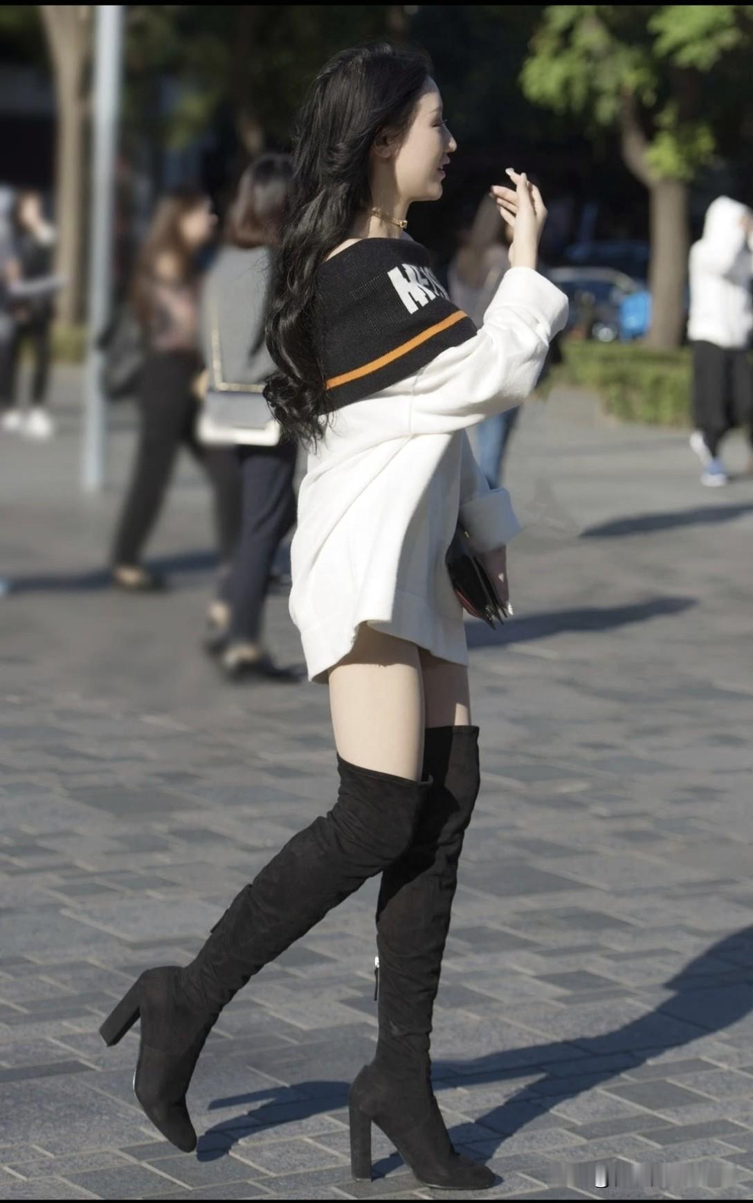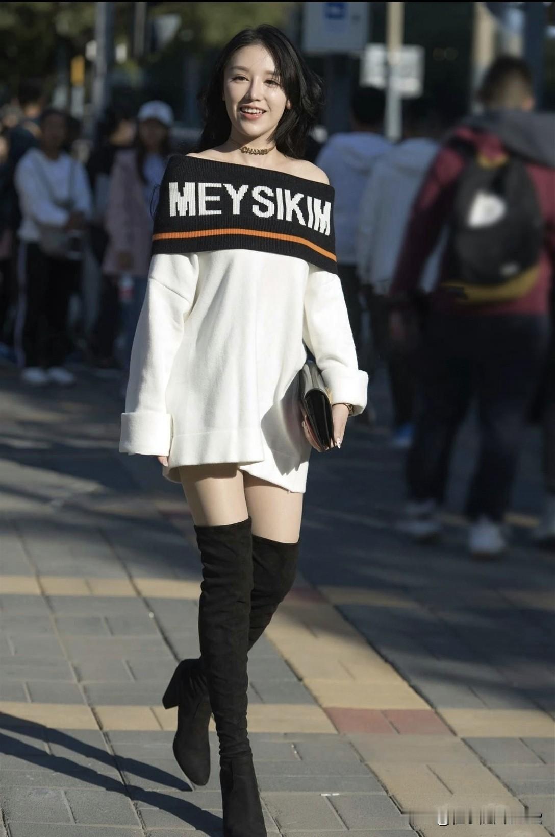 时尚街拍,黑白拼接毛衣搭配黑色长靴,自信满满