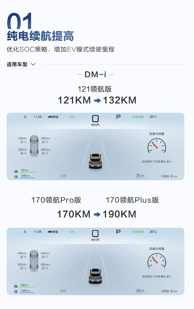 值得一提的是,前不久海狮06刚经过一次OTA升级,部分车型纯电续航有所提升:DM-i121领航版由121km提升至132km;170领航Pro版和170领航Plus版续航由170km提升至190km。新增长续航功能,海狮06DM-i170领航Pro版和170领航Plus版开启后,可进一步增加EV模式CLTC续驶里程至205km。