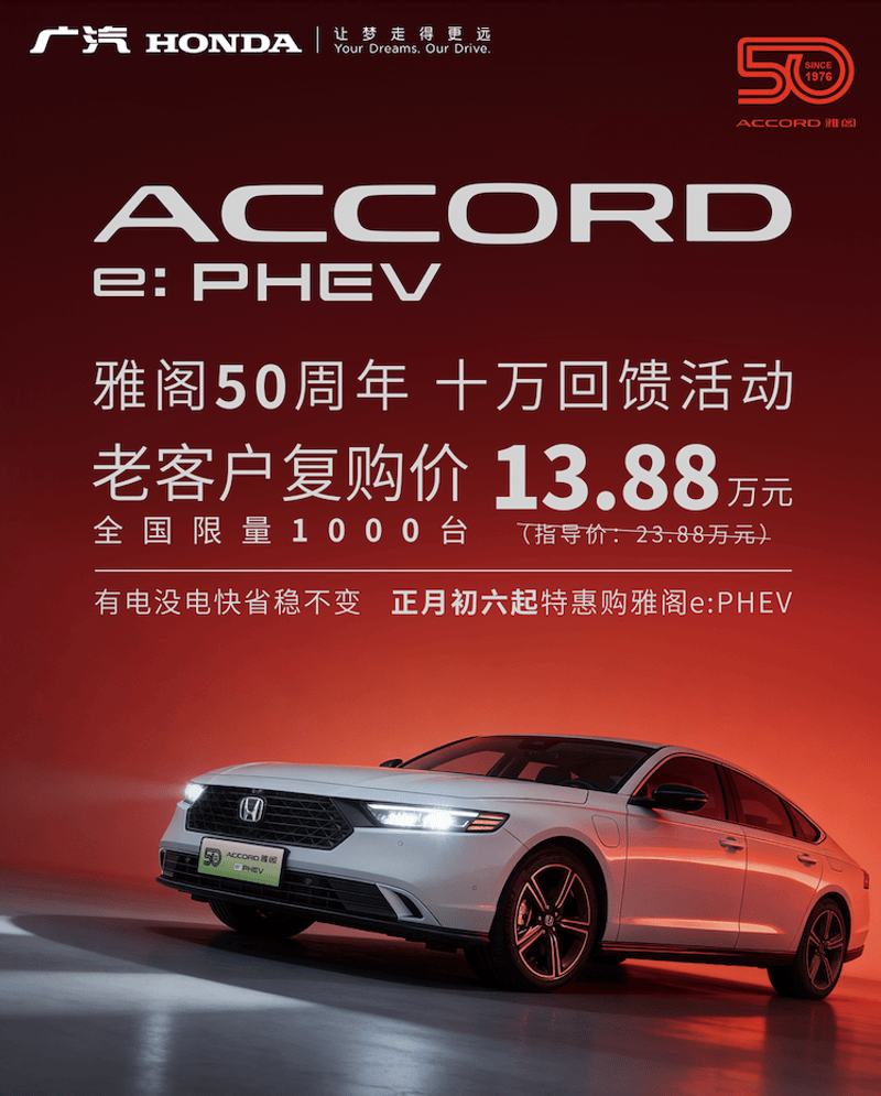 易车讯2月22日广汽本田官方发布“雅阁50周年十万回馈活动”,雅阁e:PHEV老客户复购价13.88万元,正月初六正式启售,全国限量1000台。